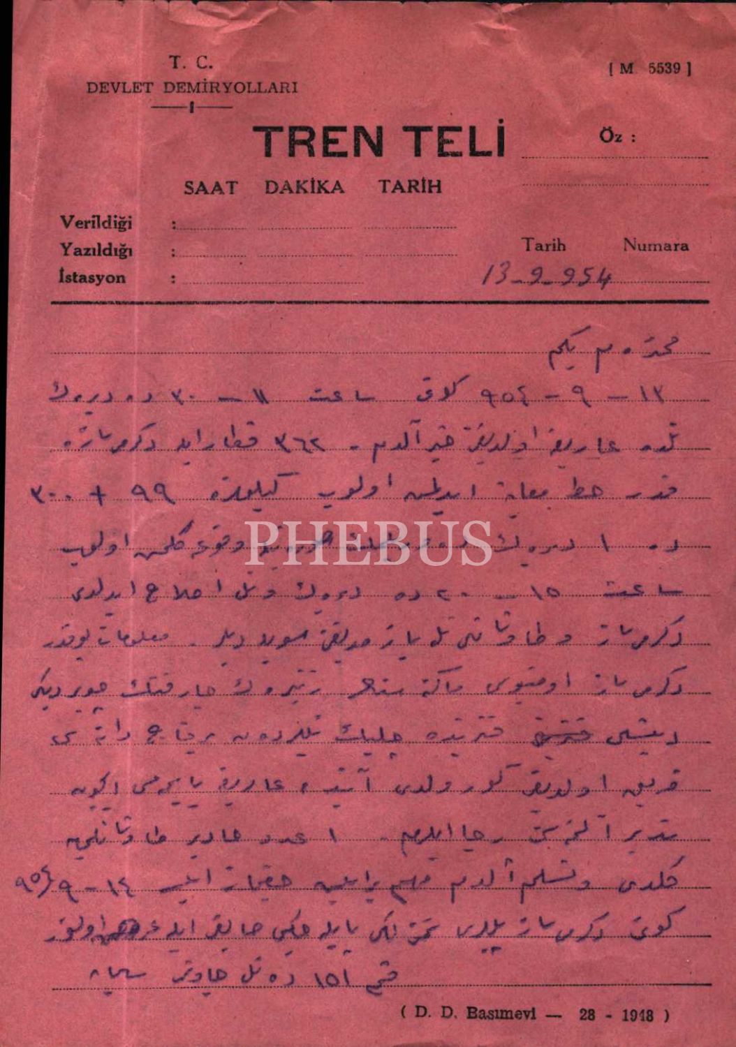 T.C. Devlet Demiryolları antetli, 1954 tarihli Osmanlıca mektup, 13x19 cm