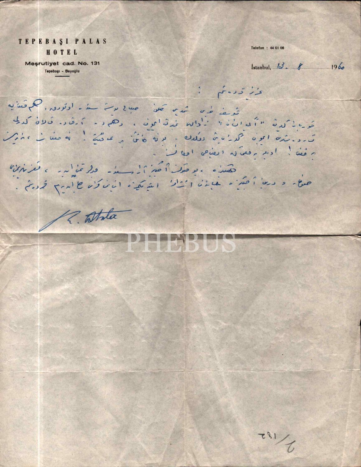 Tepebaşı Palas Hotel antetli, 1960 tarihli Osmanlıca mektup, 22x28 cm