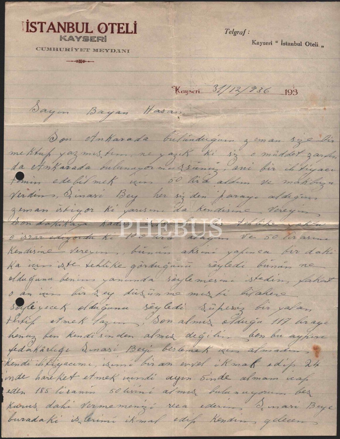 İstanbul Oteli- Kayseri antetli, 1936 tarihli mektup, 21x27 cm