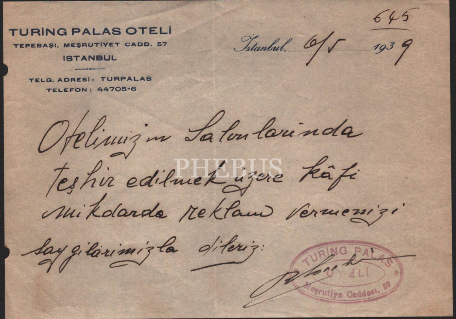 Turing Palas Oteli antetli, 1939 tarihli dilekçe, 13x19 cm