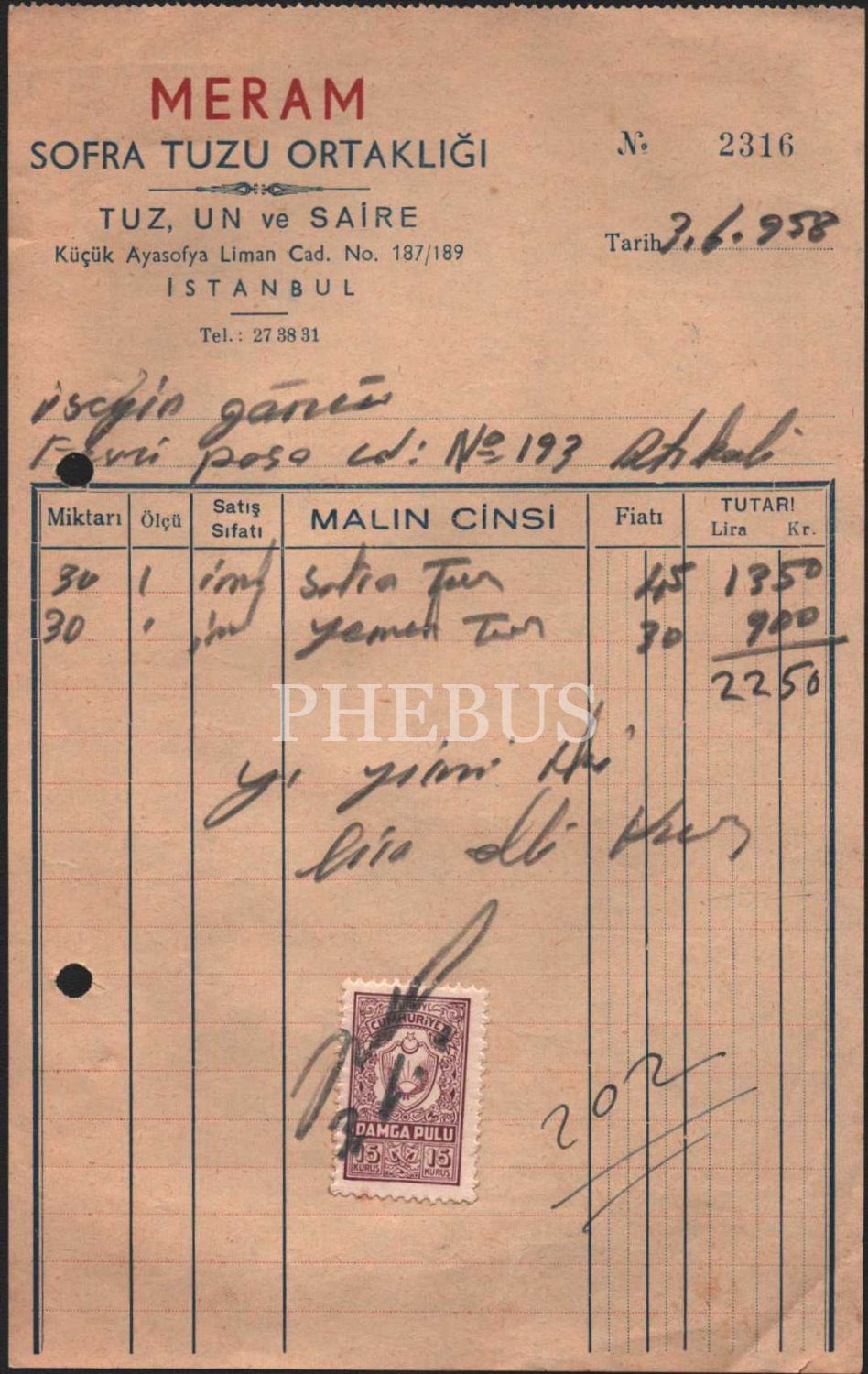 Meram Sofra Tuzu Ortaklığı antetli, 1958 tarihli fatura, 13x21 cm