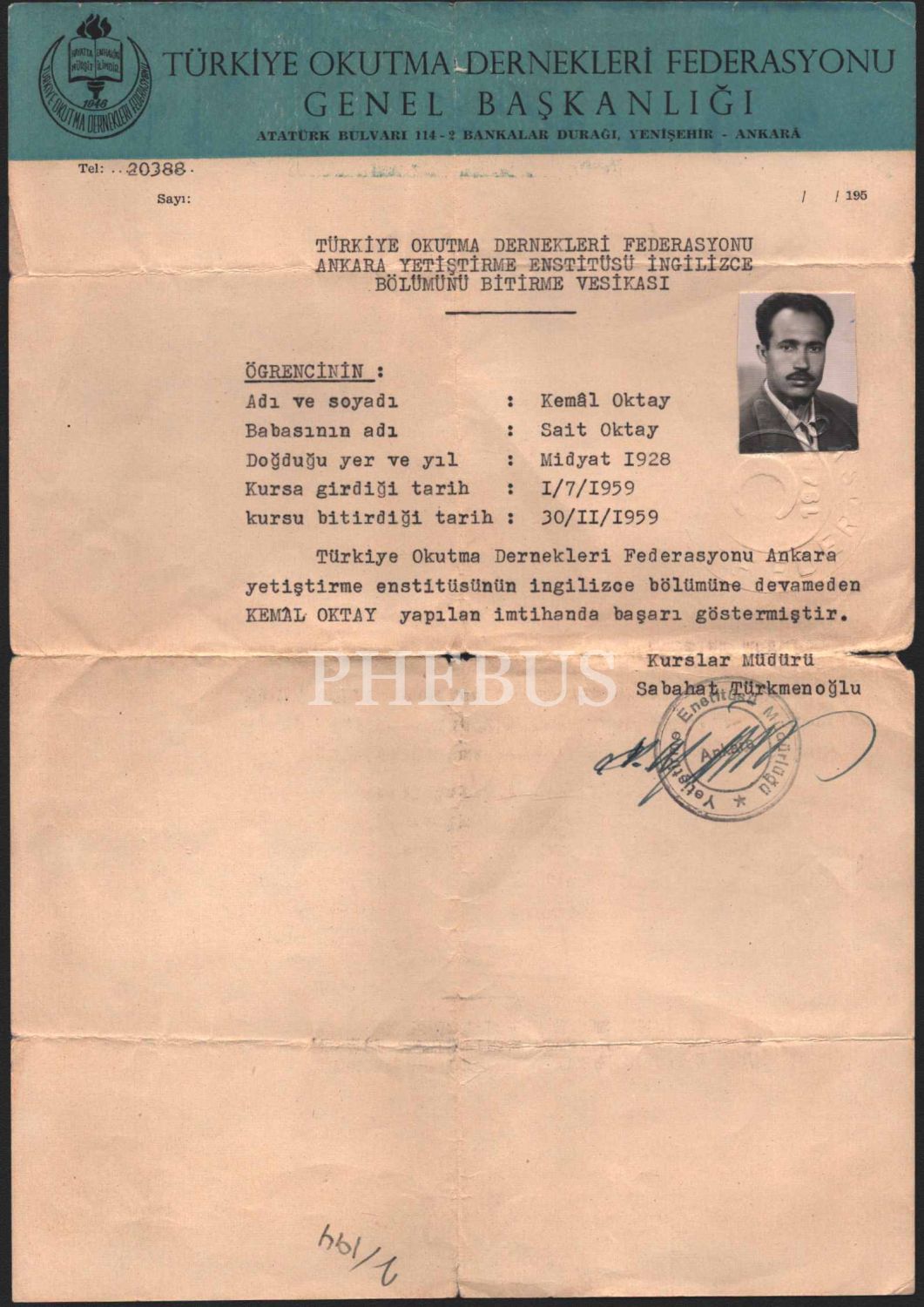 Eğitim tarihi: Türkiye Okutma Dernekleri Federasyonu Ankara Yetiştirme Enstitüsü sertifikası, 1959 tarihli ve fotoğraflı, 19x28 cm