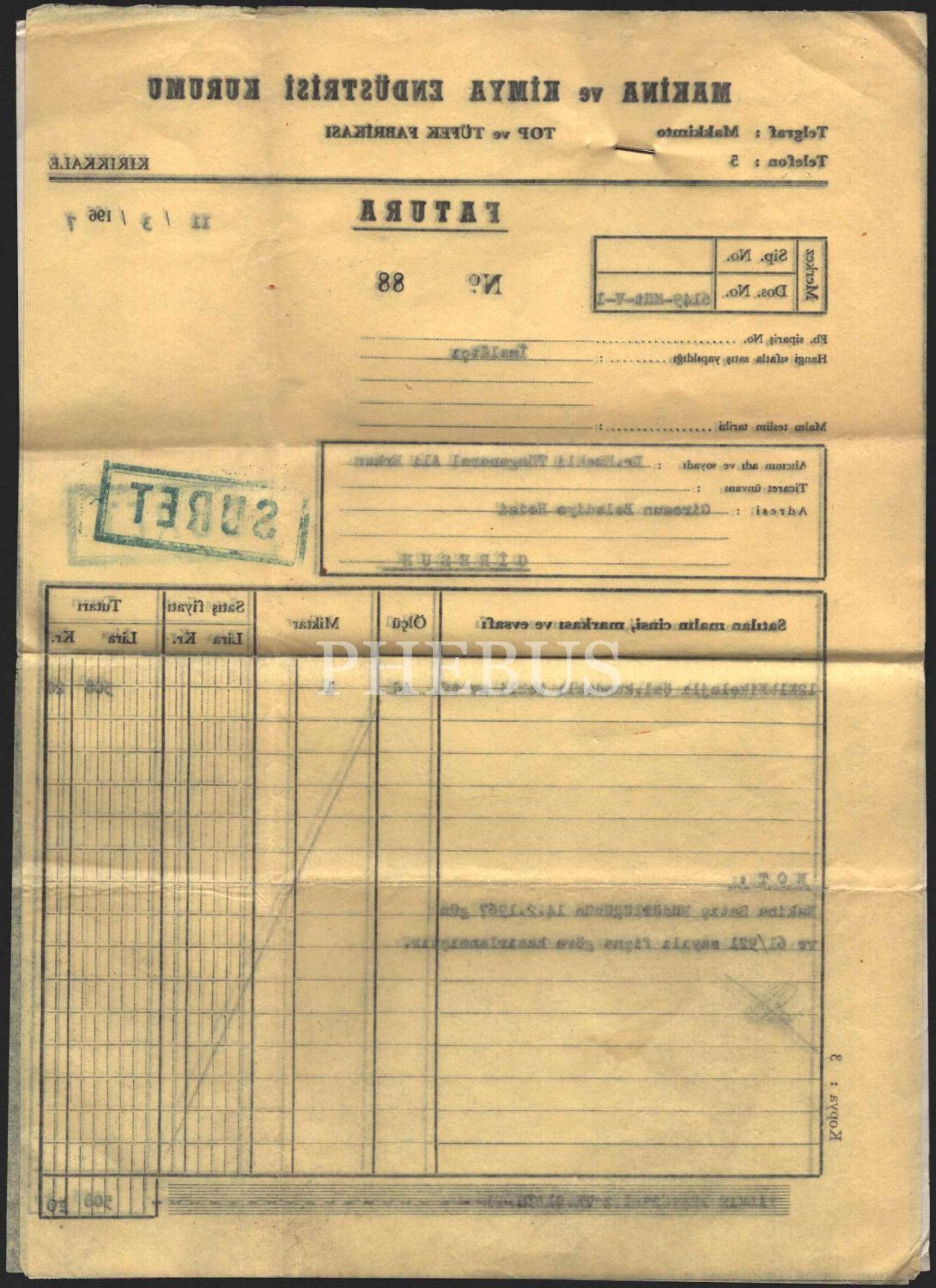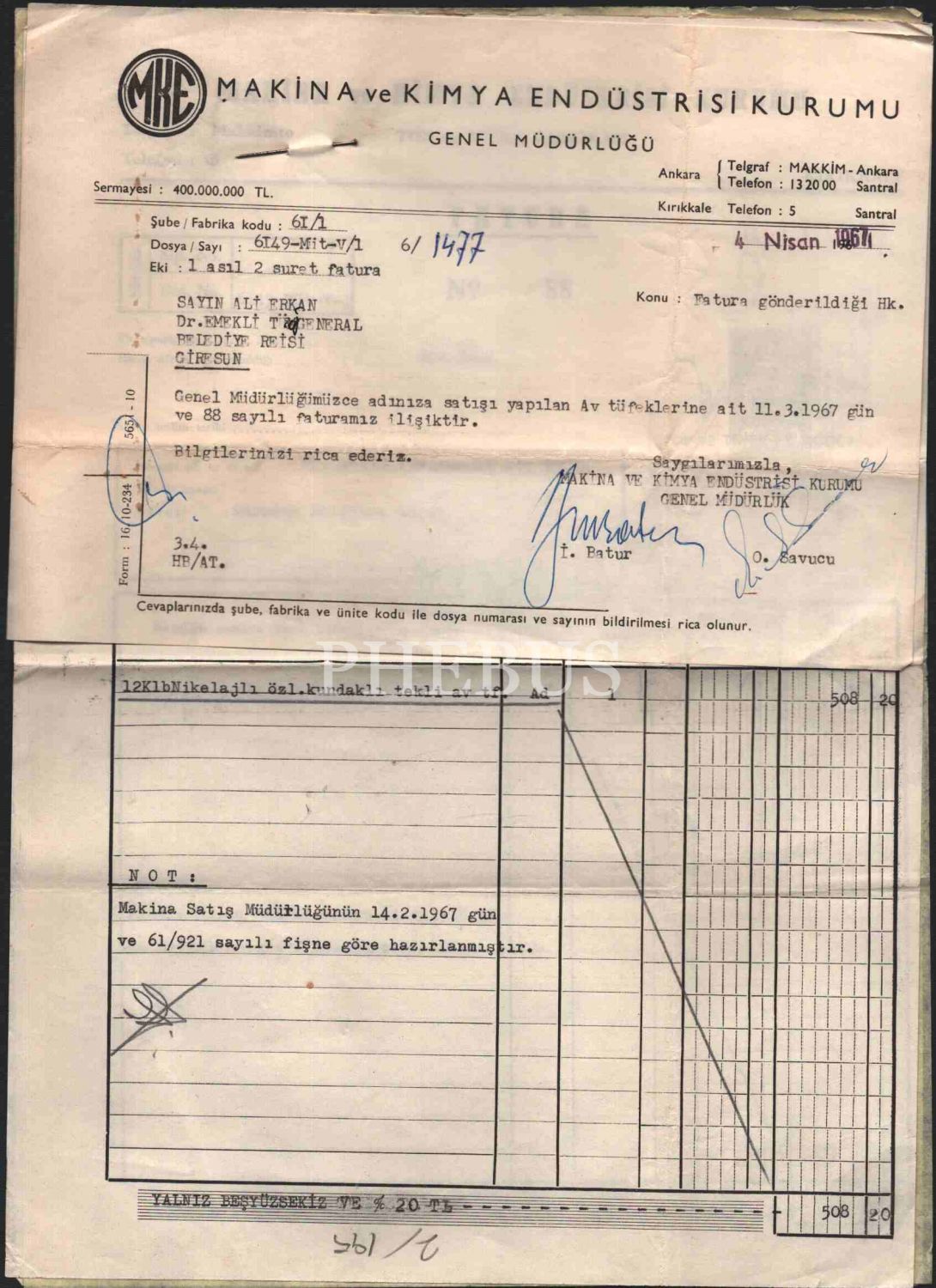 Makina ve Kimya Endüstrisi Kurumu antetli, 1967 tarihli fatura, 14x20 cm