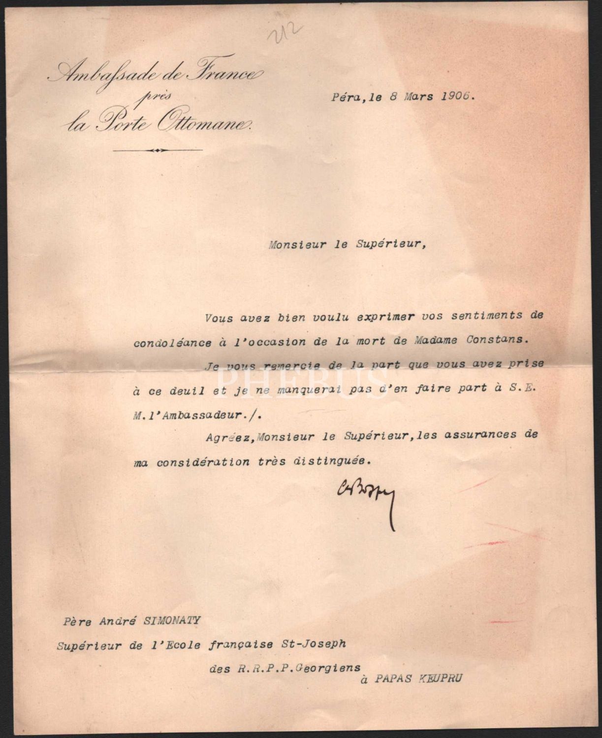 Ambassade de France pres In Porte Ottomane antetli, 1906 tarihli Fransızca evrak, 20x25 cm