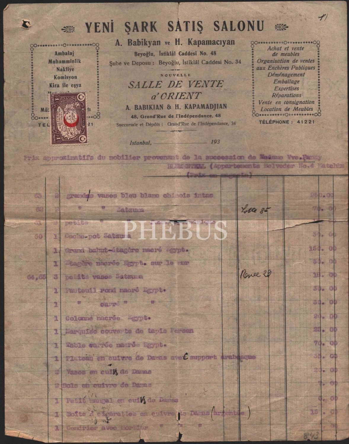 Yeni Şark Satış Salonu A. Babikyan ve H. Kapamacıyan antetli Fransızca-Türkçe fatura, İstanbul 1930'lu yıllar, 22x28 cm