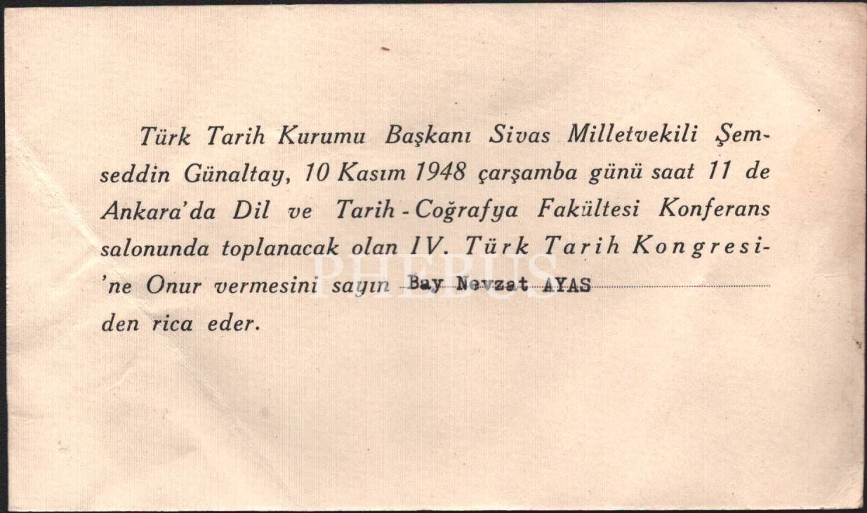 İstanbul ve İzmir eski valisi Nevzat Ayas´a gönderilen IV. Türk Tarih Kongresi´ne katılım davetiyesi, 8x15 cm