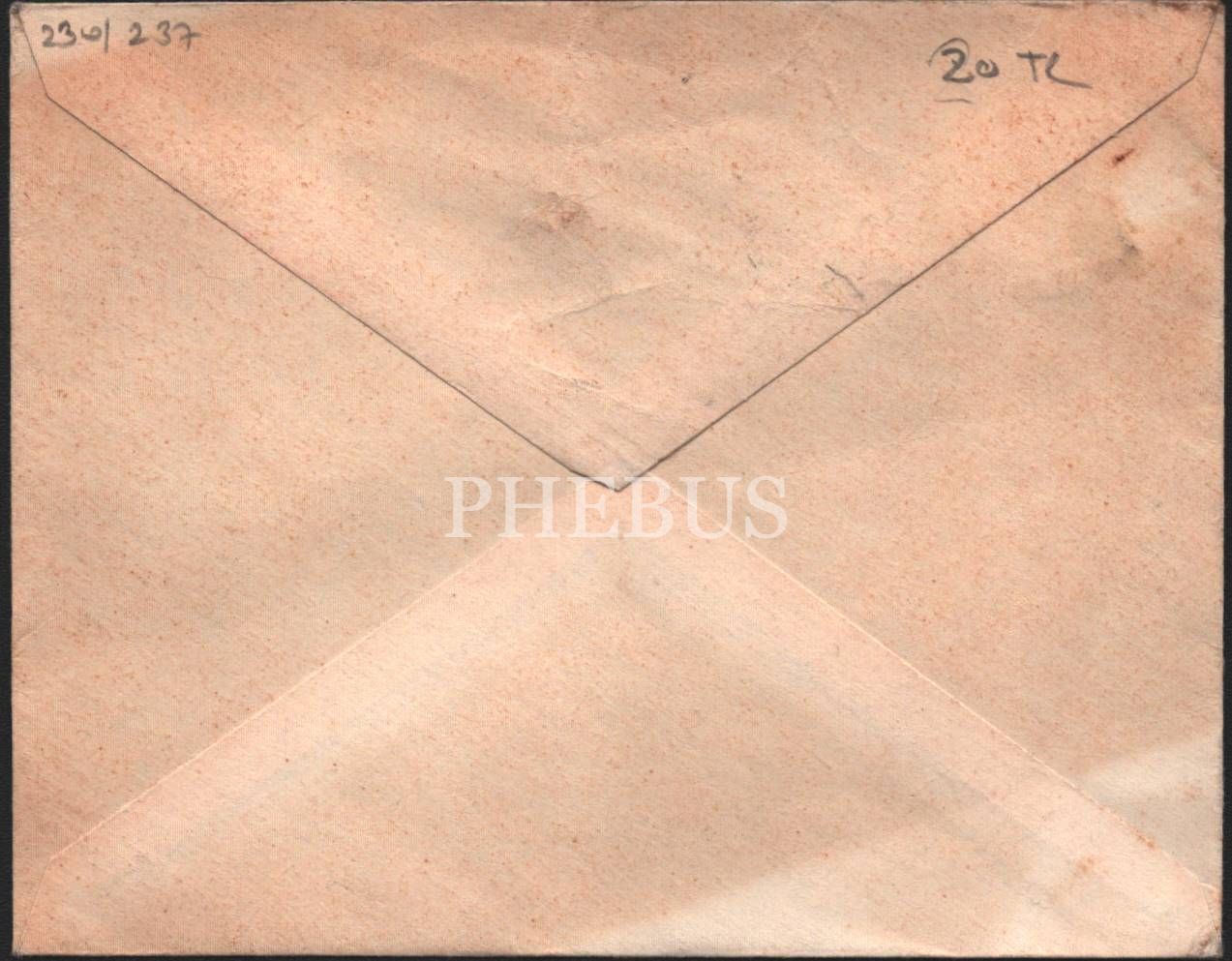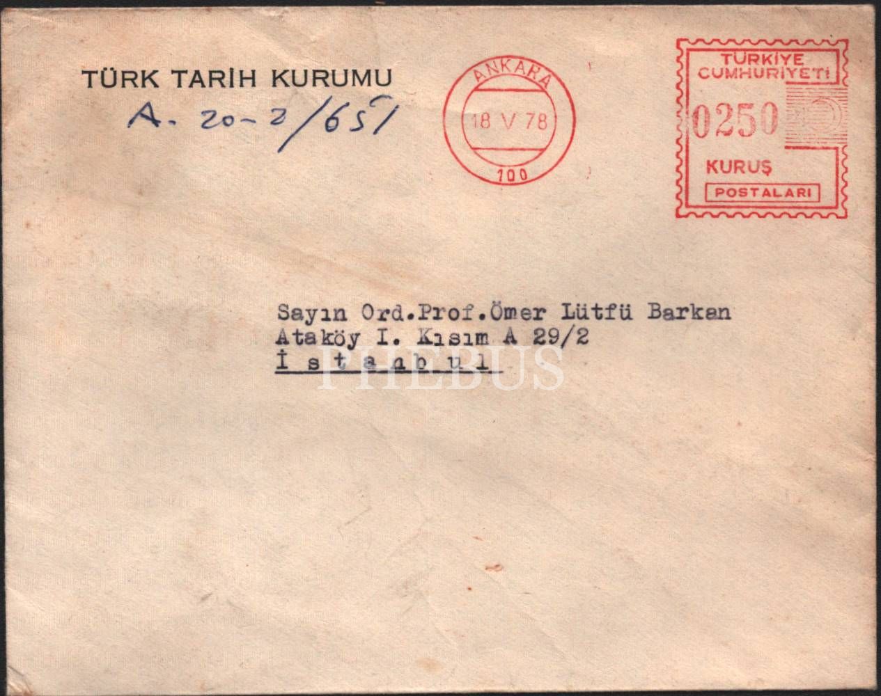 Ord. Prof. Ömer Lütfü Barkan´a gönderilen TTK antetli ve damgalı zarf, 12x15 cm