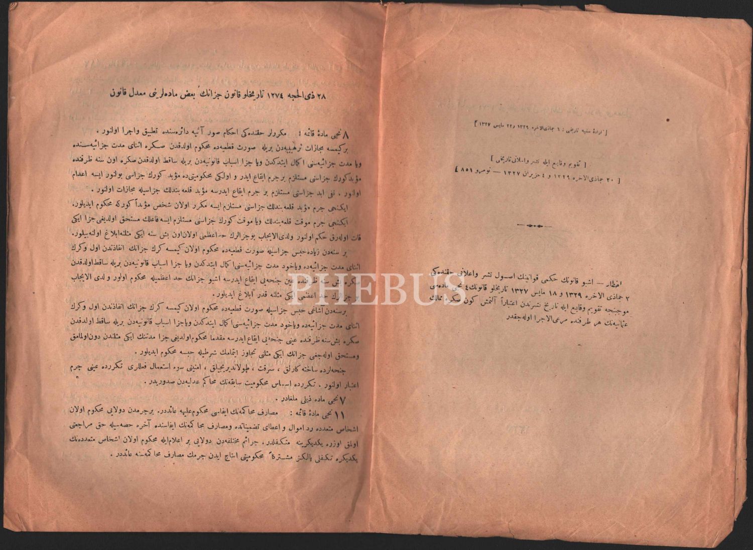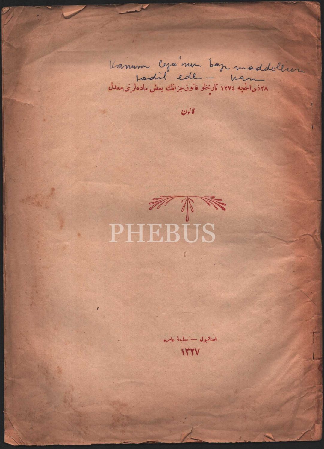 Hukuk tarihi: 28 ZİLHİCCE 1274 TARİHLİ CEZA KANUNUNUN BAZI MADDELERİNİ DÜZENLEYEN KANUN, Amire Matbaası, İstanbul 1327, 19x27