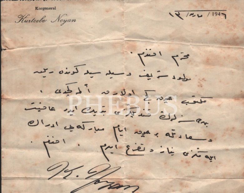 Korgeneral Kurtcebe Noyan antetli kâğıtta 1946 tarihli kandil tebrik mektubu, 13x16 cm