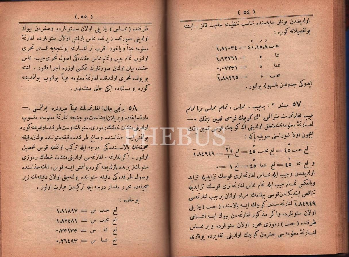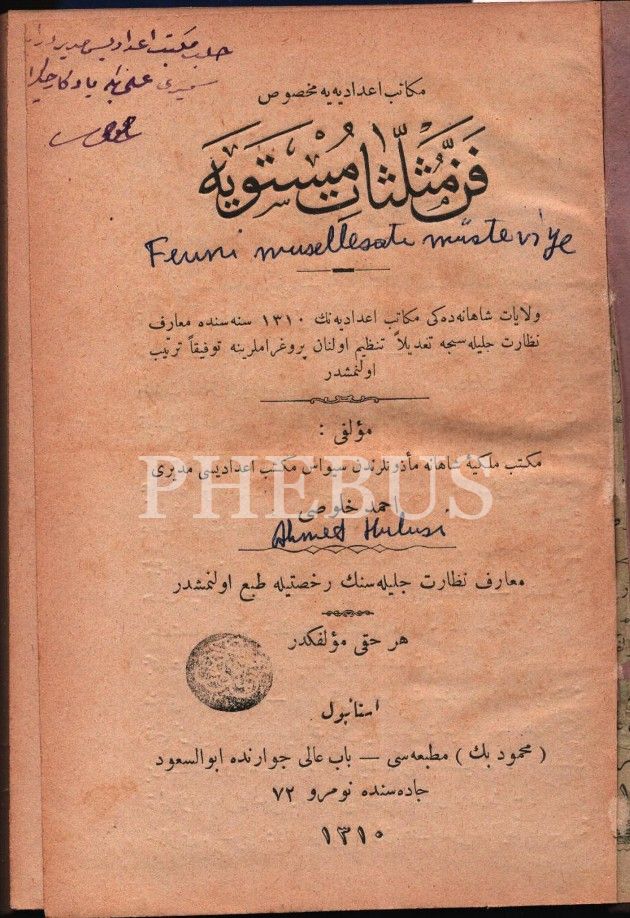 Eğitim tarihi: FENN-İ MÜSELLESÂT-I MÜSTEVİYE [Düzlem Trigonometri], Ahmed Hulusi, ithaflı-imzalı, Mahmud Bey Matbaası, İstanbul 1310, 128 s.,12x18 cm