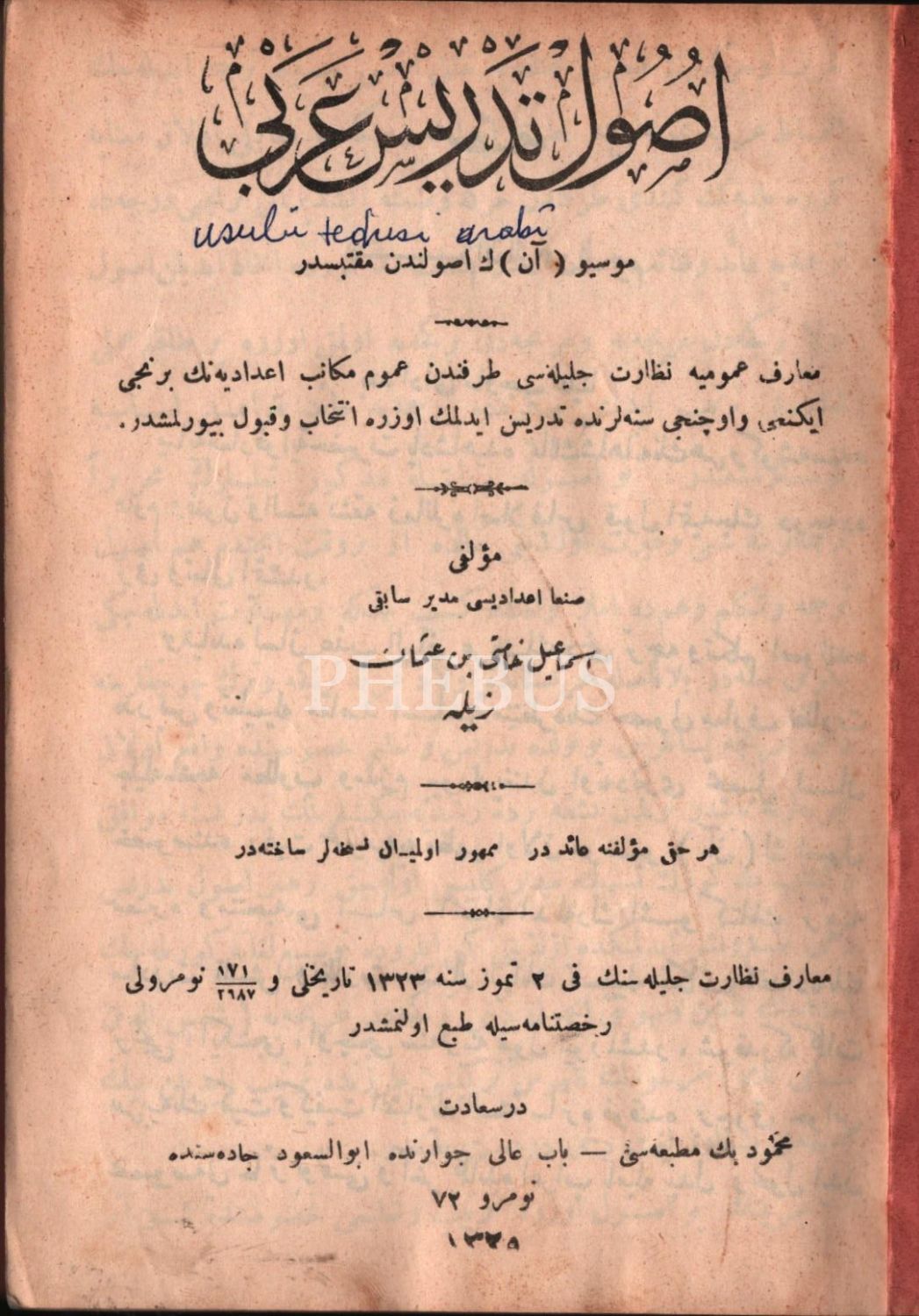 Dilbilgisi: Osmanlı armalı ve ay yıldızlı cildinde USÛL-İ TEDRÎS-İ ARABÎ [Arapça Öğretim Yöntemi], İsmail bin Osman, İstanbul 1325, 188 s., 14x20 cm