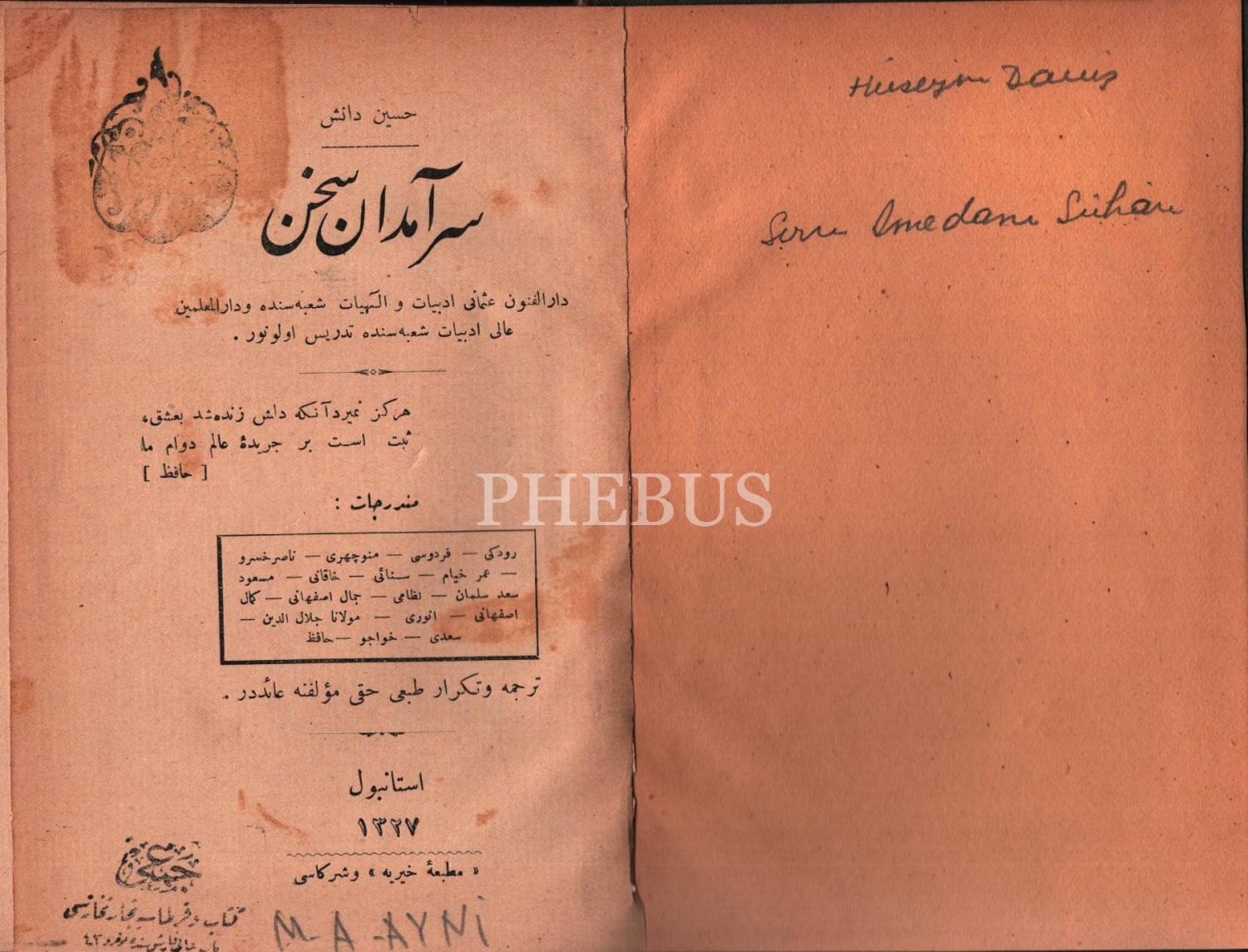 Eğitim tarihi: SERÂMEDÂN-I SOHEN [Söz Ustaları], Hüseyin Daniş, Hayriye Matbaası, İstanbul 1327, 448 s., 13x18 cm