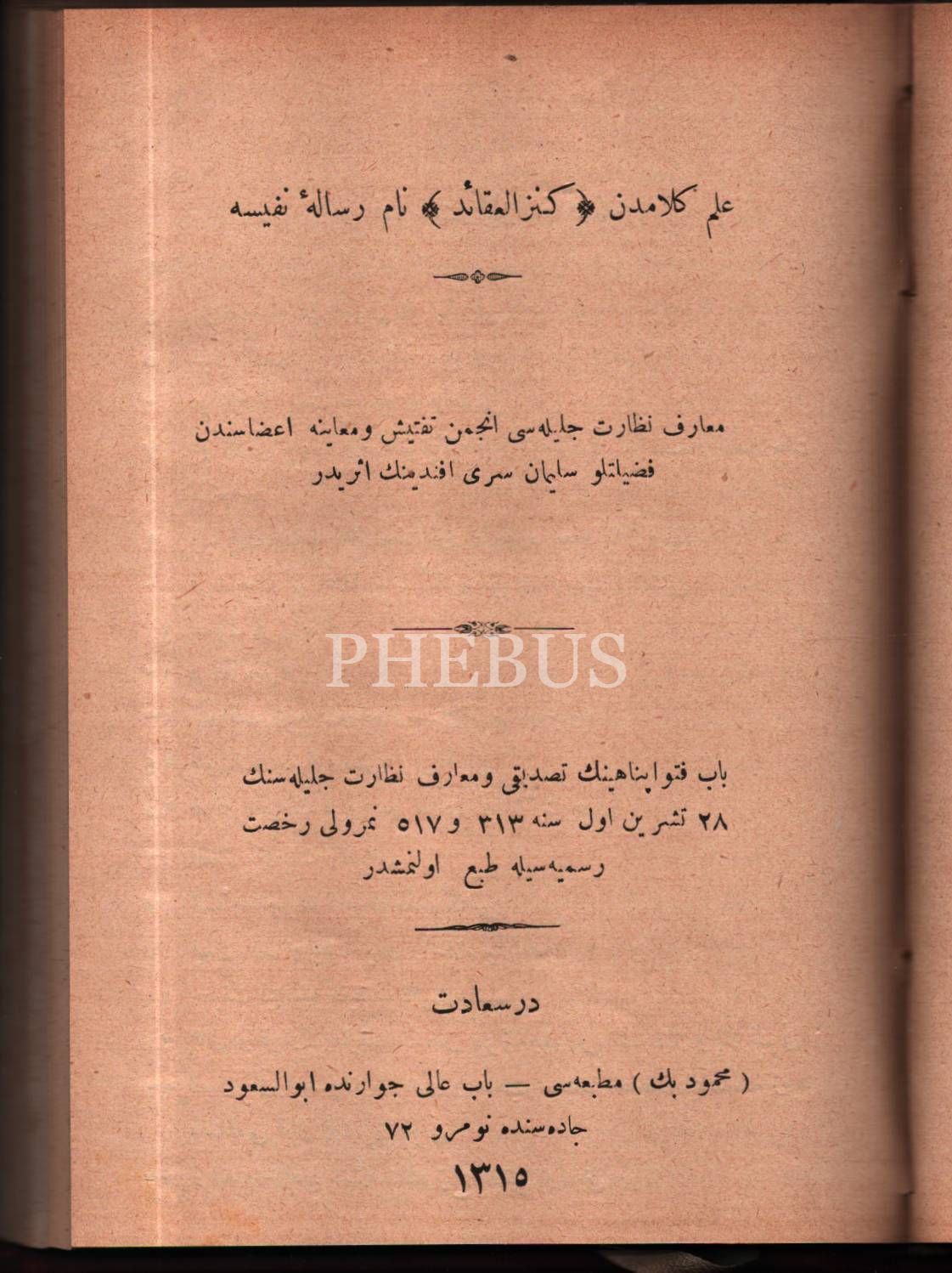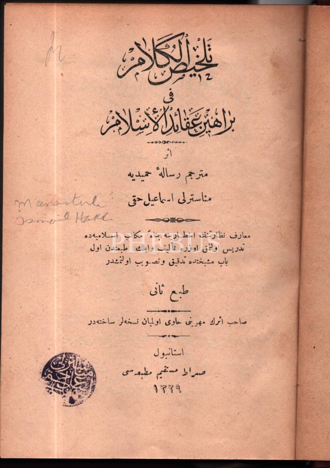 4 kitap tek ciltte: TELHÎSÜ´L-KELÂM FÎ BERÂHÎN-İ AKÂİDİ´L-İSLÂM, Manastırlı İsmail Hakkı, Sırat-ı Müstakim Matbaası, İstanbul 1329, 104 s.; KENZÜ´L-AKÂİD, Süleyman Sırrı Efendi, Mahmud Bey Matbaası, İstanbul 1315, 109 s.;