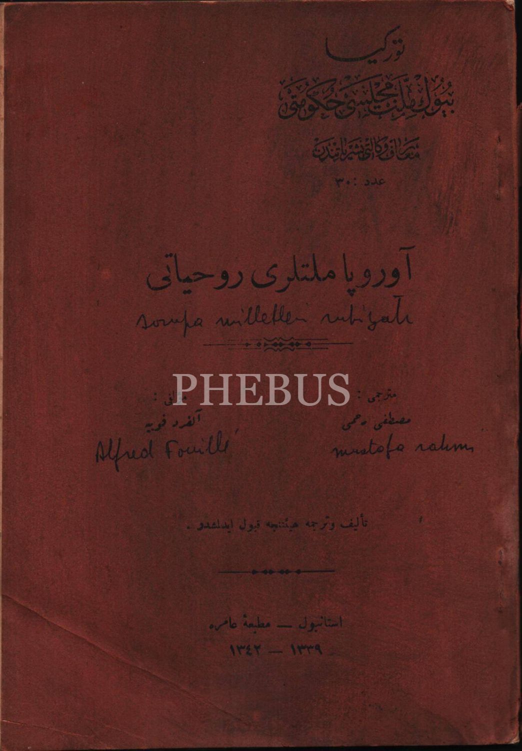 Tıp tarihi: AVRUPA MİLLETLERİ RÛHİYYÂTI, Alfred Fouillee, çev. Mustafa Rahmi [Balaban], Amire Matbaası, İstanbul 1342, 100 s., 13x20 cm