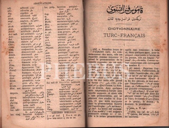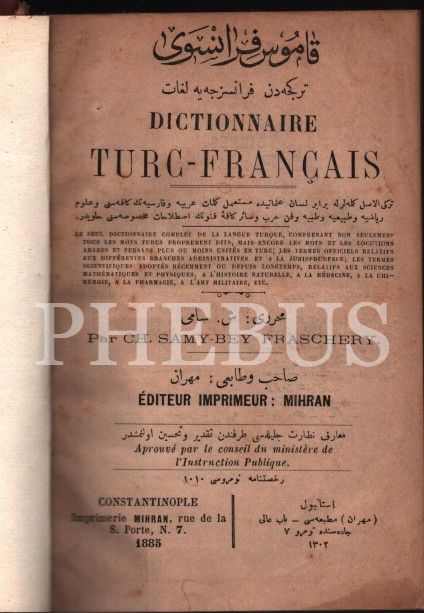 Sözlük: KÂMÛS-I FRANSEVÎ (Türkçeden Fransızcaya Lügât), Şemseddin Sami, Mihran Matbaası, İstanbul 1302, 1208 s., 11x17 cm