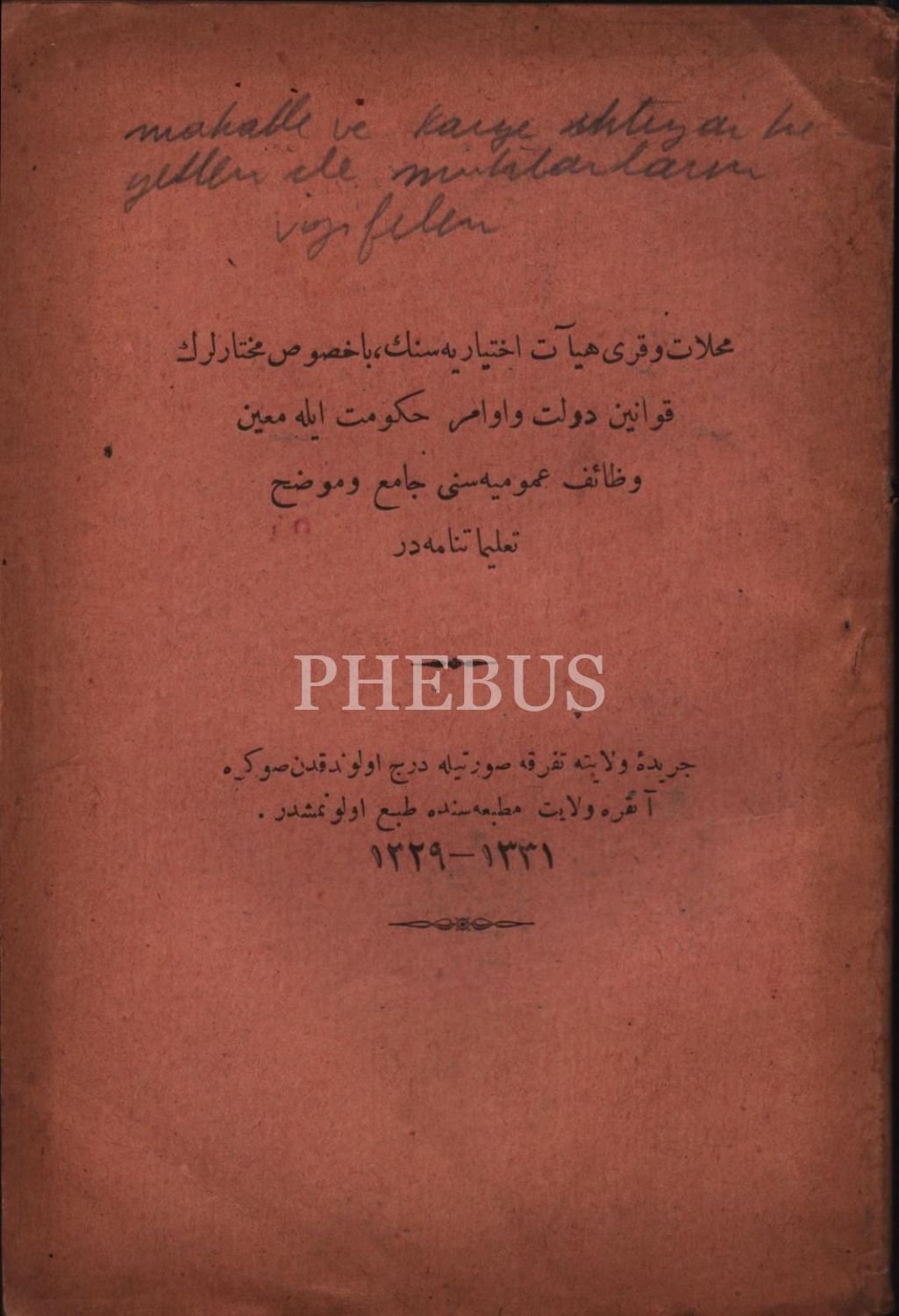 İhtiyar Heyeti ve Muhtarların Vazifelerine Dair Talimatnâme, Ankara Vilayet Matbaası, 1329-1331, 109 s., 13x19 cm