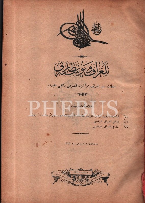 İletişim tarihi: Osmanlı armalı ve ay yıldızlı cildinde Fransızca-Osmanlıca TELGRAF VE POSTA NEZÂRETİ RESMÎ REHBERİ, Asır Matbaası, İstanbul 1323, 228+235 s., 20x28 cm, sırtı ayrık haliyle