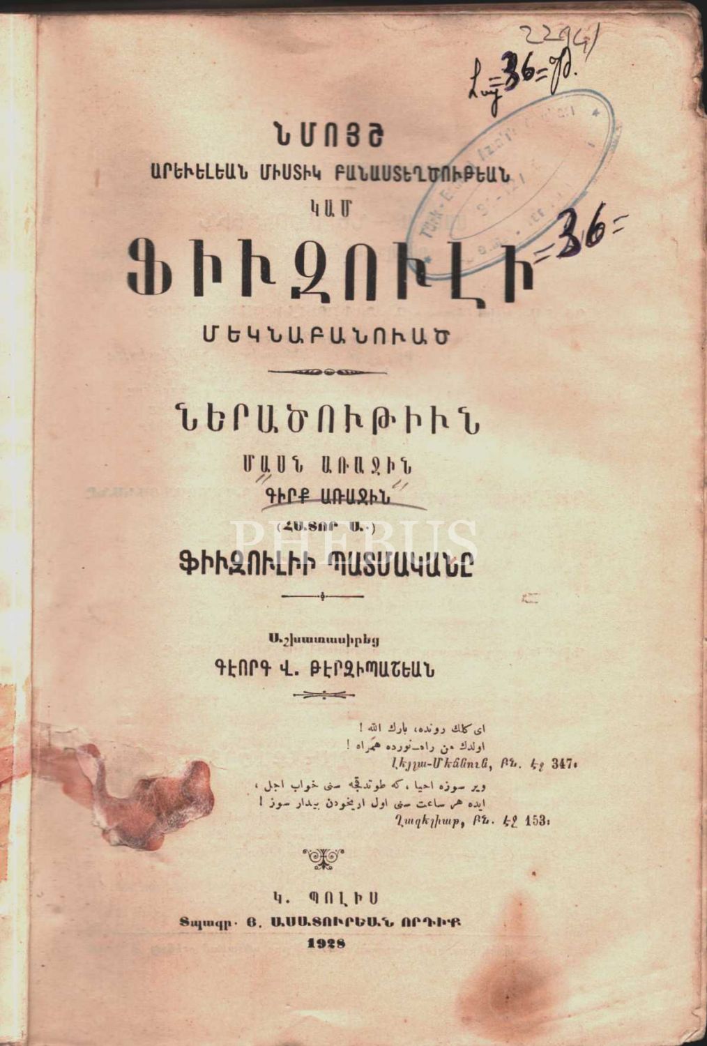 FUZULİ VE AÇIKLAMALAR (1. Kısım), K. V. Terzibaşyan, Asaduryan Evlatları Matbaası, İstanbul 1928