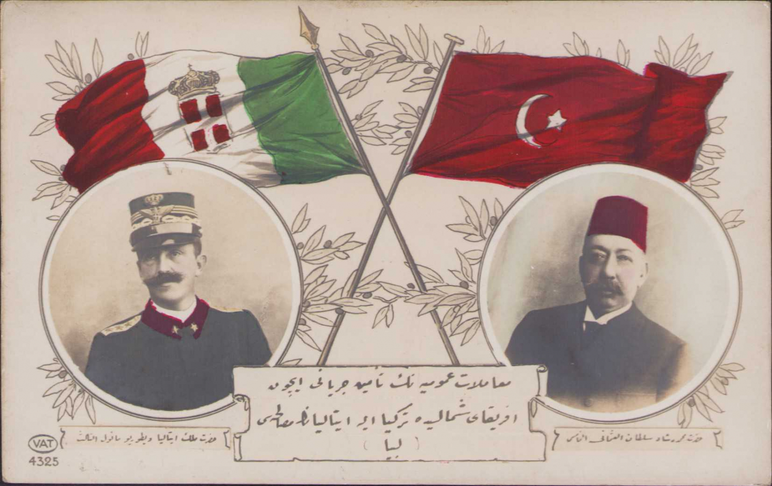 Türk İtalyan Savaşı Propaganda Kartpostalı, Sultan Reşat ve İtalyan komutan portre ve bayrak temalı kartpostal. Osmanlı'nın Afrika için İtalya ile görüşmesi.