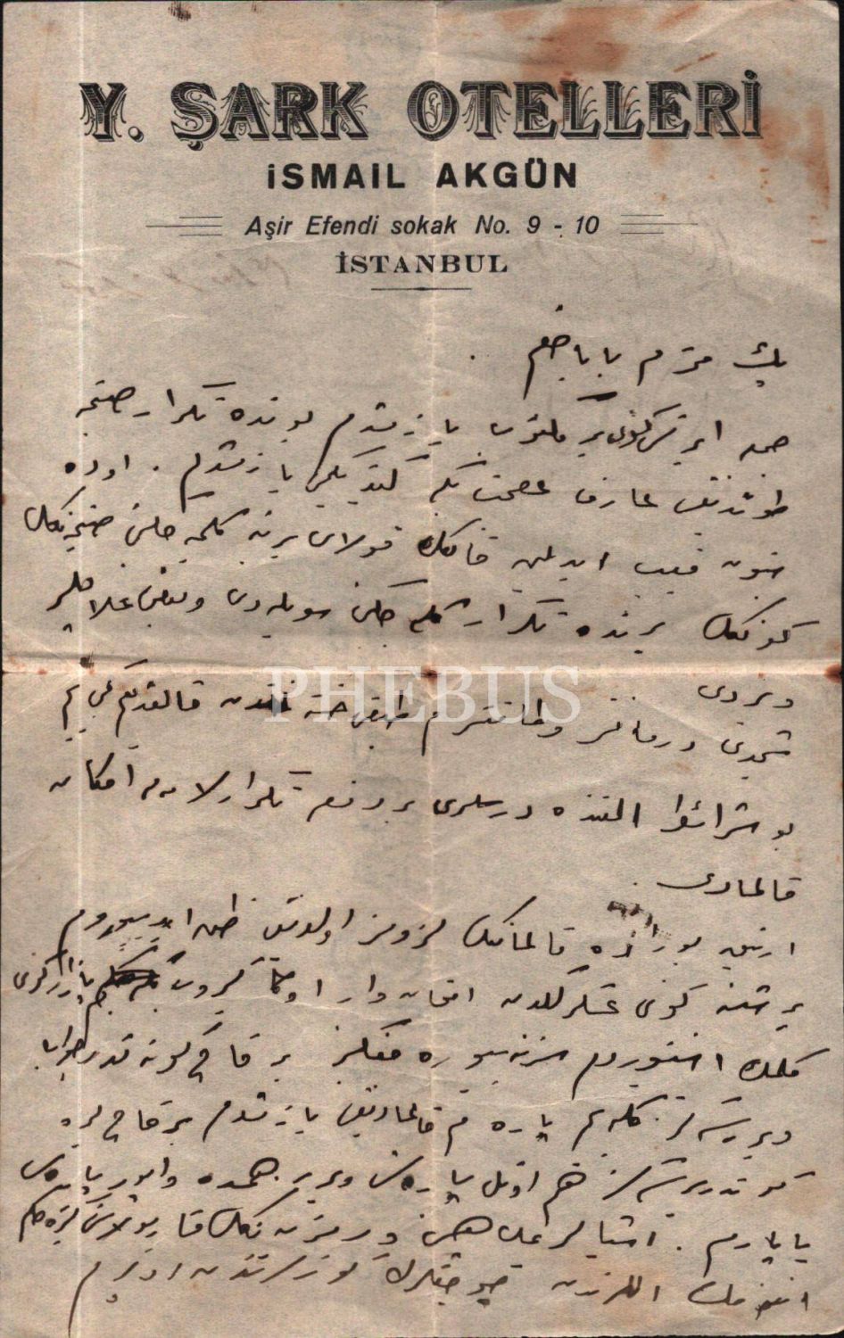 Y. Şark Otelleri antetli kâğıt üzerine yazılmış mektup, 14x23 cm