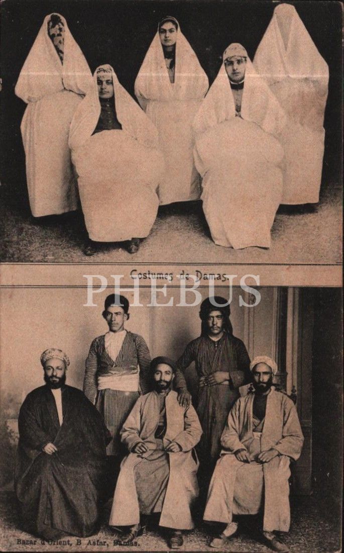 Şam yerel kıyafetleri içinde kadın ve erkekler
