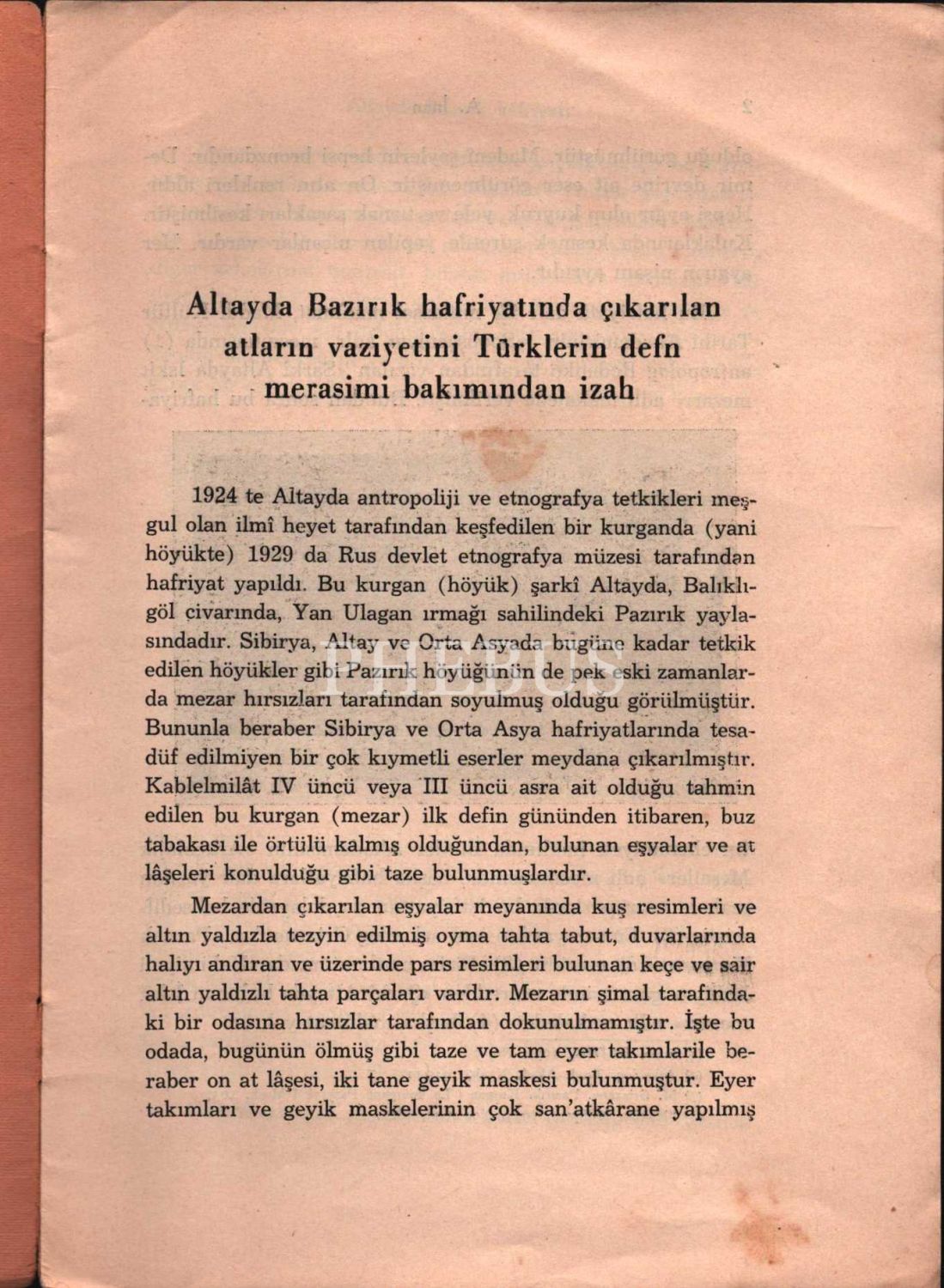 II. TÜRK TARİHİ KONGRESİ- ALTAYDA BAZIRIK HAFRİYATINDA ÇIKARILAN ATLARIN VAZİYETİNİ TÜRKLERİN DEFİN MERASİMİ BAKIMINDAN İZAH, Afet İnan, Devlet Basımevi, İstanbul 1937, 12 s., 17x24 cm