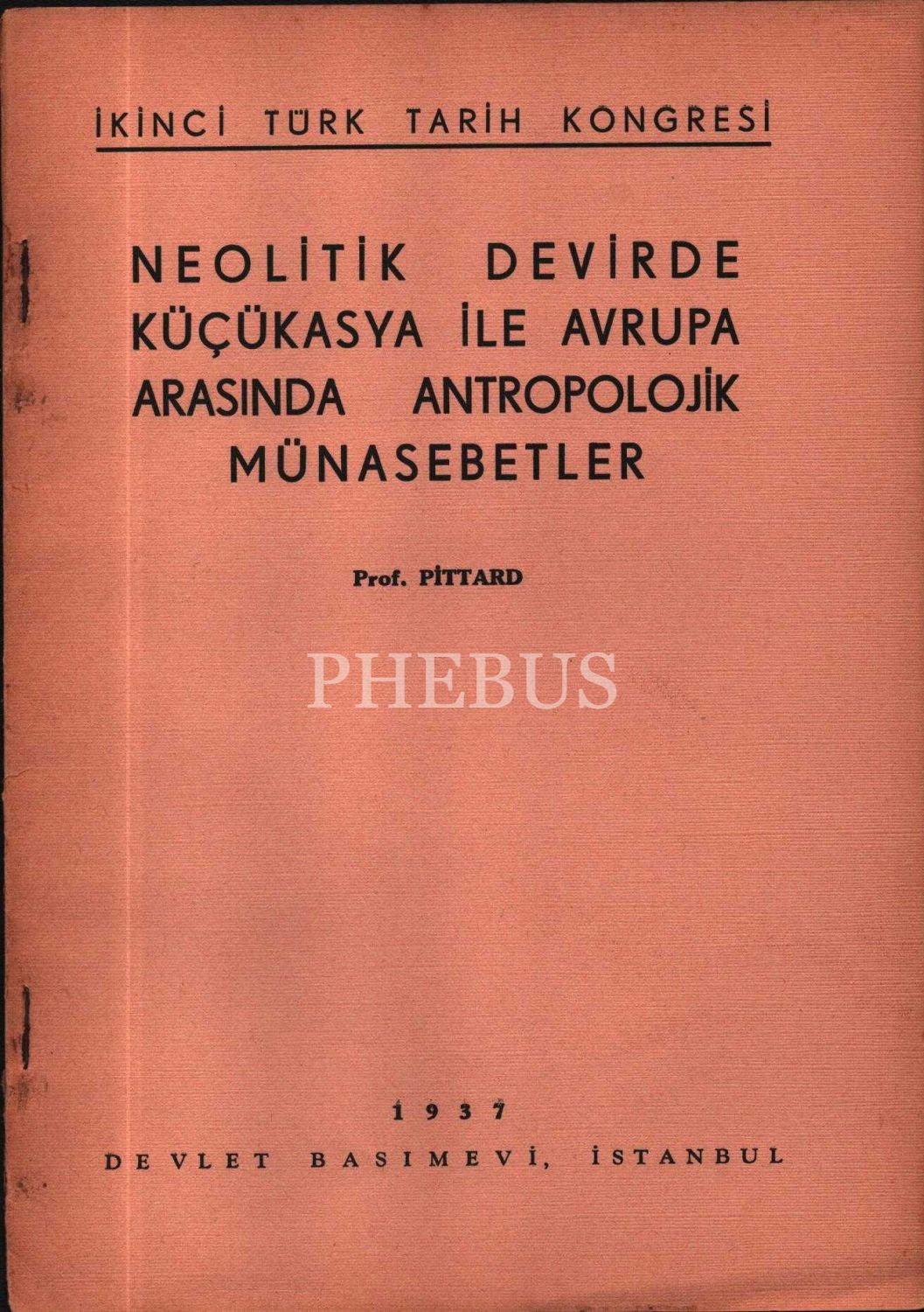 II. TÜRK TARİHİ KONGRESİ NEOLİTİK DEVİRDE KÜÇÜKASYA İLE AVRUPA ARASINDA ANTROPOLOJİK MÜNASEBETLER, Prof. Pittard, Devlet Basımevi, İstanbul 1937, 23 s., 17x24 cm
