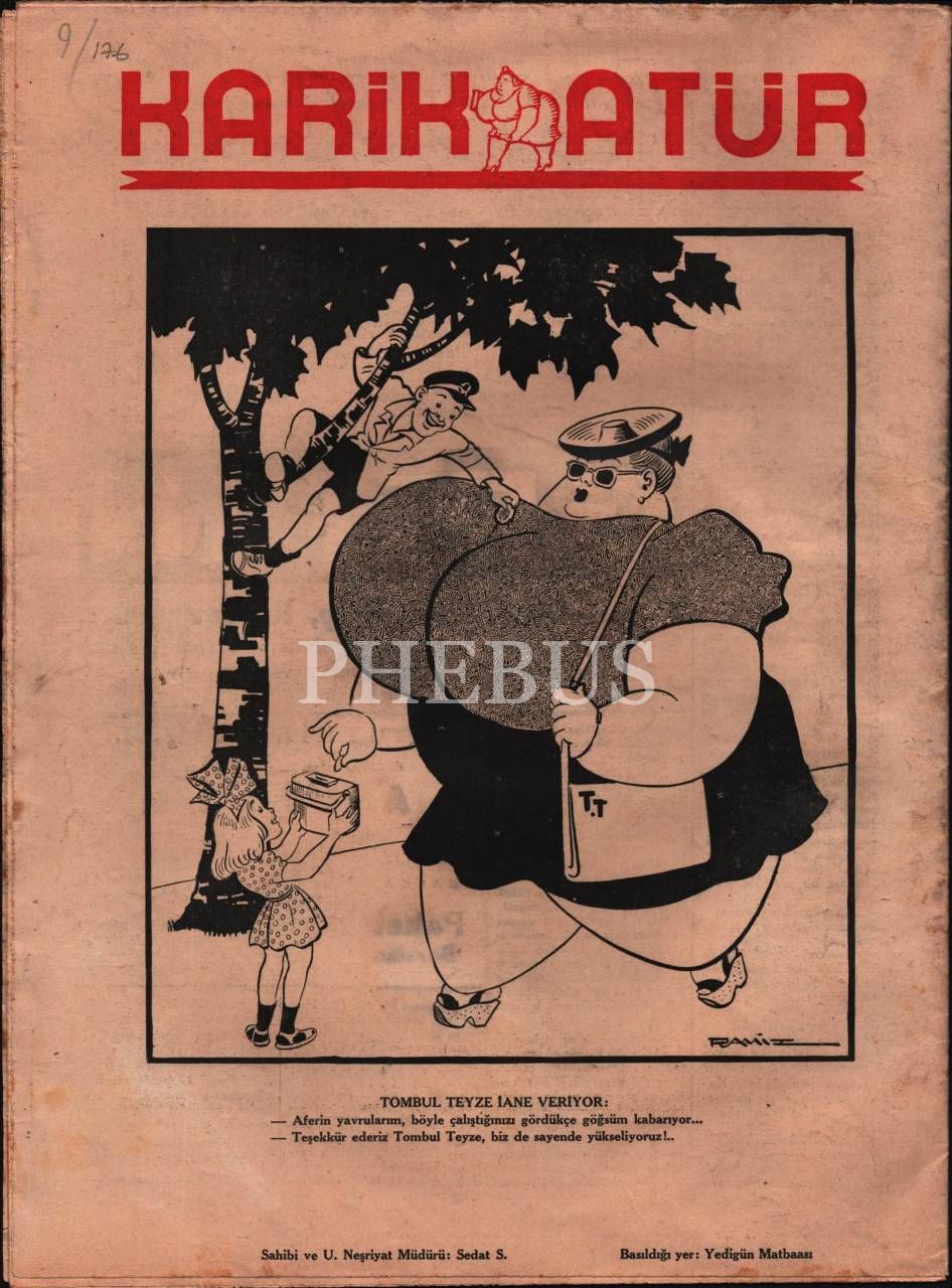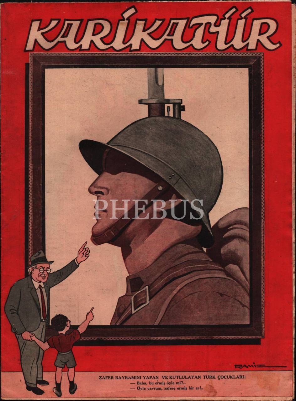 Siyasi ve edebî mizah mecmuası KARİKATÜR´ün, Zafer Bayramı´na dair Ramiz imzalı kapak görselli 296. sayısı, 28 Ağustos 1941, 25x33 cm