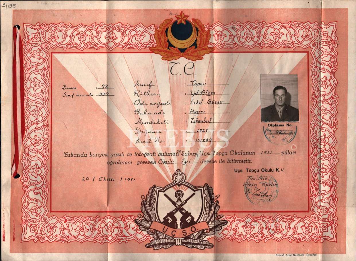 UÇS. Topçu Okulu fotoğraflı diploması, 1951 tarihli, 27x36 cm