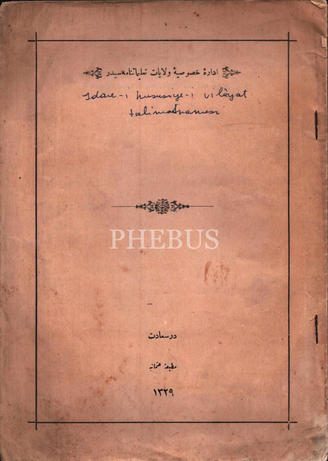 İDARE-İ HUSUSİYE-İ VİLÂYÂT TALİMATNAMESİ, Osmaniye Matbaası, İstanbul 1329, 10 s., 19x26 cm