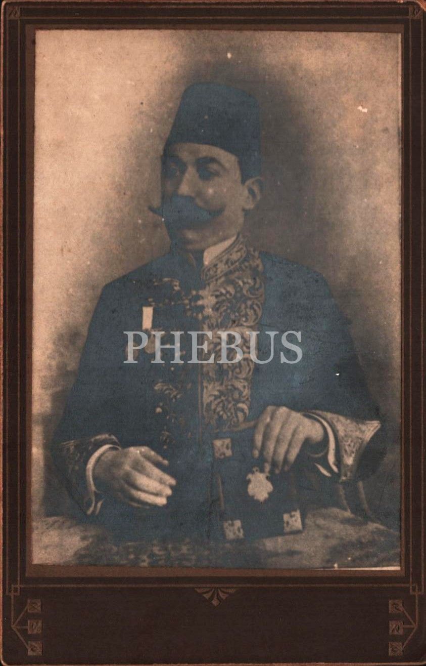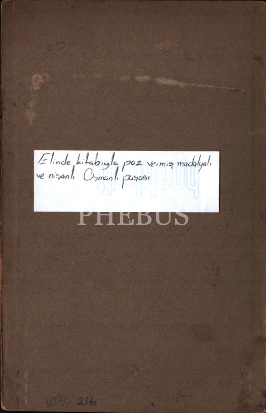 Elinde kitabıyla poz vermiş madalyalı ve nişanlı Osmanlı paşasının kabin fotoğrafı, 11x17 cm