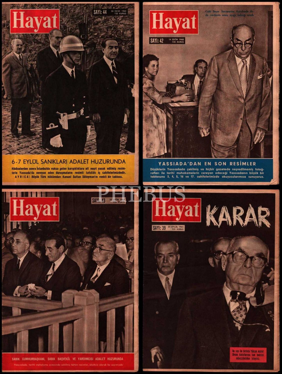 Siyasi tarih: HAYAT dergisinin, Yassıada Mahkemeleri konulu kapak görselli 4 sayısı, 1960-61 tarihli, 25x34 cm