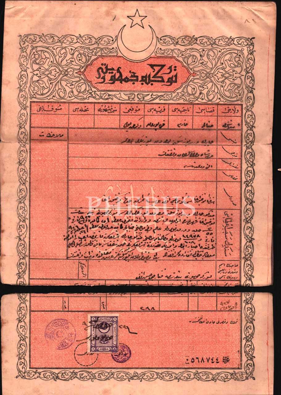 Mihrişah Valide Sultan Vakfı´ndan tapu senedi, İstanbul 1927, 22x32 cm, haliyle