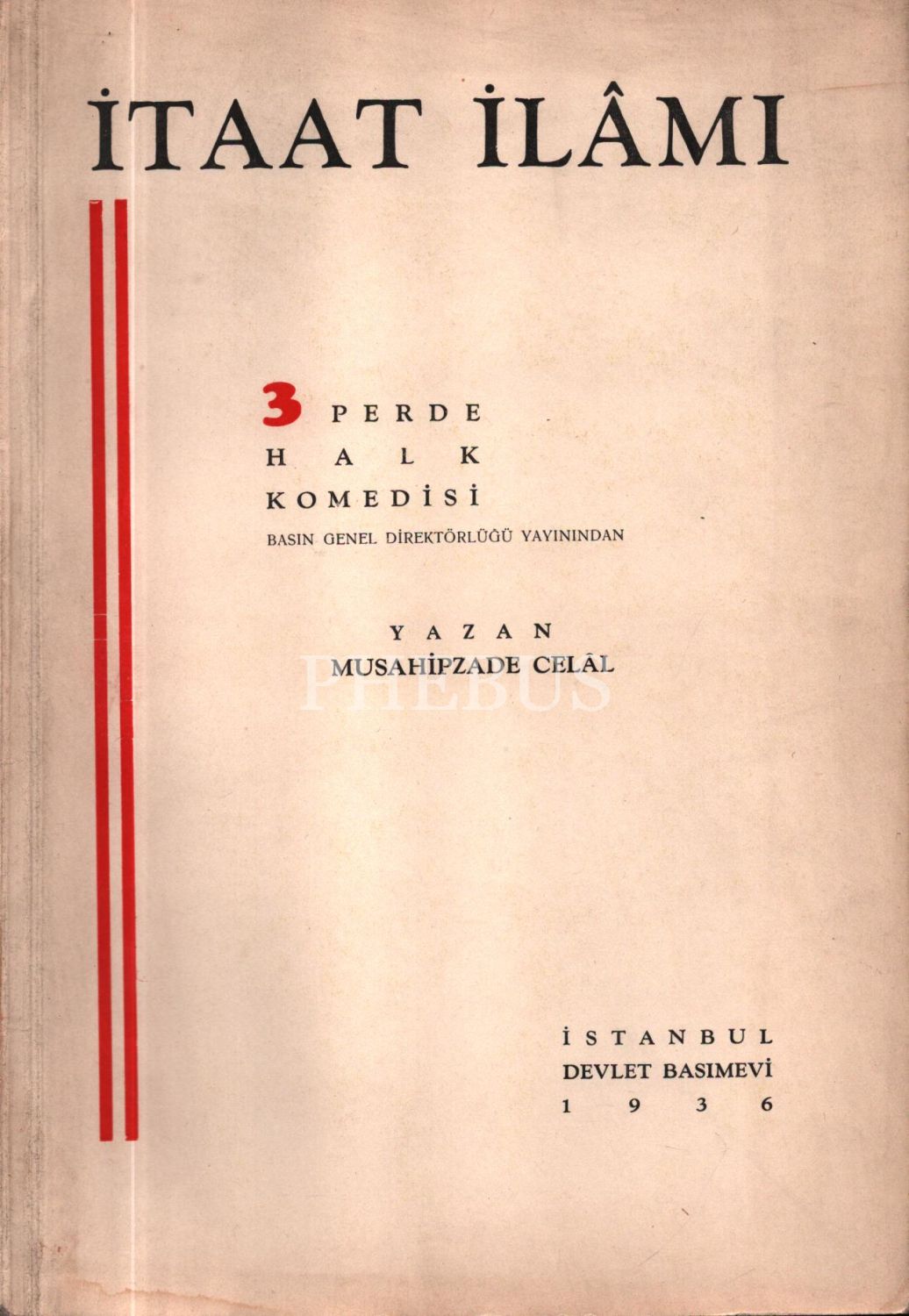 İTAAT İLÂMI (3 Perde Halk Komedisi), Musahipzade Celâl, Basın Genel Direktörlüğü Yayını, 1936, 81 sayfa
