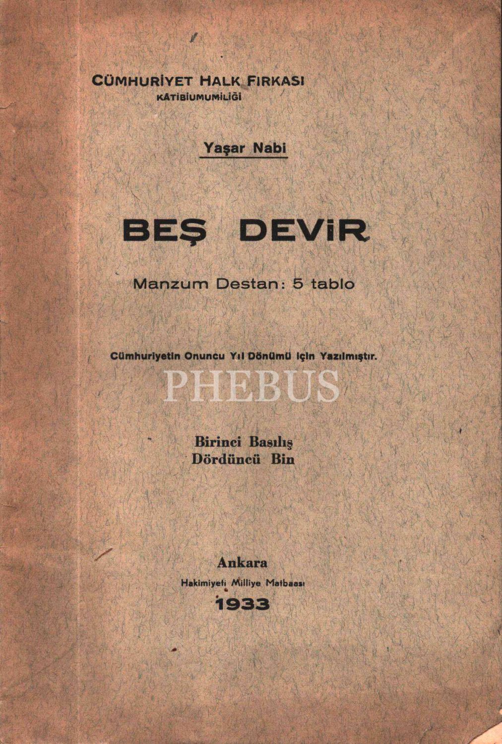 BEŞ DEVİR (Manzum Destan), Yaşar Nabi, Cümhuriyet Halk Fırkası Kâtibiumumiliği, Yaşar Nabi, 1933, 31 sayfa