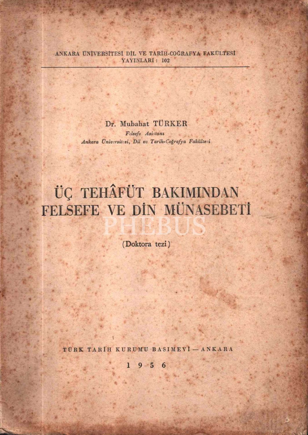 ÜÇ TEHÂFÜT BAKIMINDAN FELSEFE VE DİN MÜNASEBETİ (Doktora Tezi), AÜ DTCF Yayınları, Dr. Mubahat Türker, 1956, 419 sayfa
