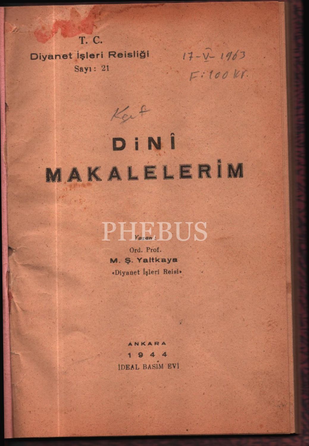 DİNÎ MAKALELERİM, Ord. Prof. M. Ş. Yaltkaya, Diyanet İşleri Reisliği, 1944, 88 sayfa