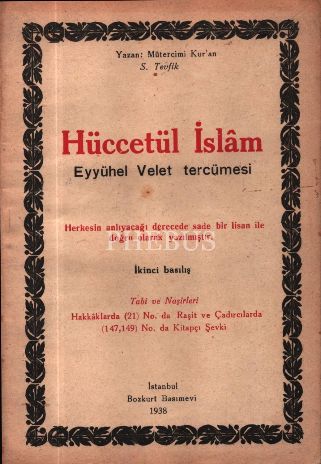 HÜCCETÜL İSLÂM (Eyyühel Velet Tercümesi), S. Tevfik, Bozkurt Basımevi, 1938, 106 sayfa