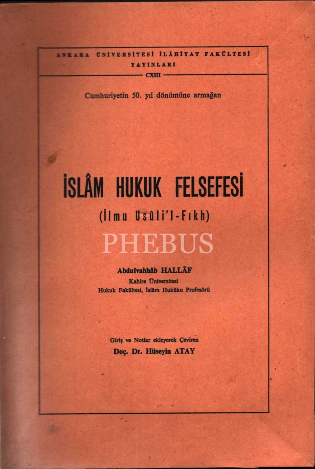 İSLÂM HUKUK FELSEFESİ (İlm-i Usûli´l-Fıkh), Abdulvahhâb Hallâf, ilave ve çev. Doç Dr. Hüseyin Altay, AÜ İlahiyat Fak. Yayınları, 1973, 390 sayfa