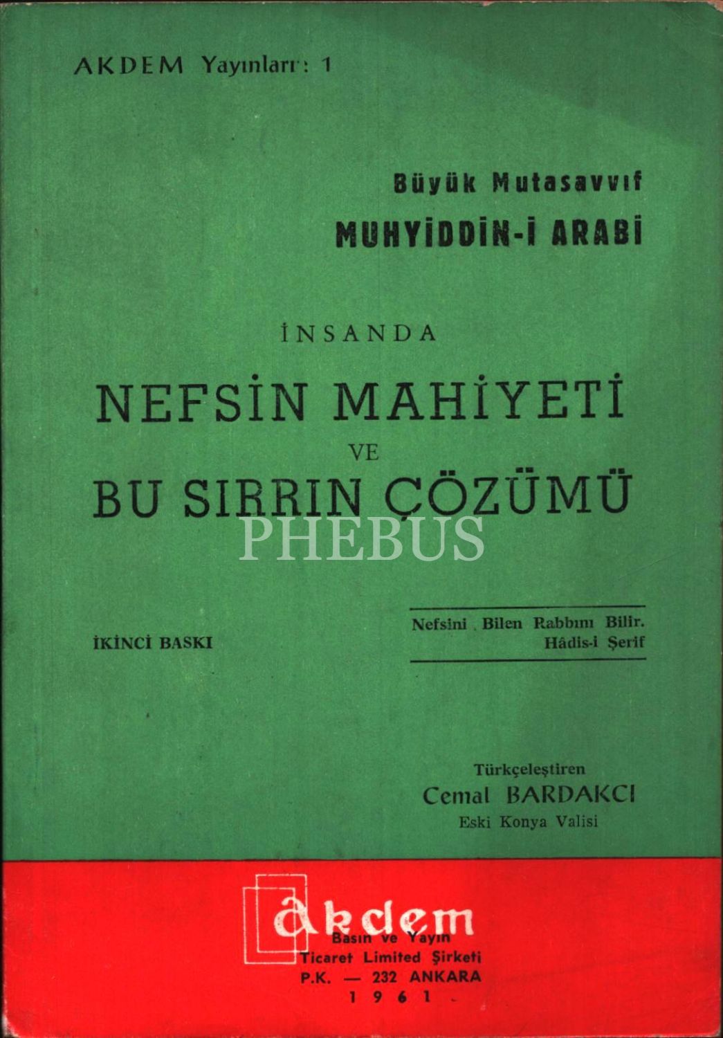 İNSANDA NEFSİN MAHİYETİ VE BU SIRRIN ÇÖZÜMÜ, Muhyiddin-i Arabi, çev. Cemal Bardakçı, Akdem Yayınları, 1961, Ankara, 36 sayfa