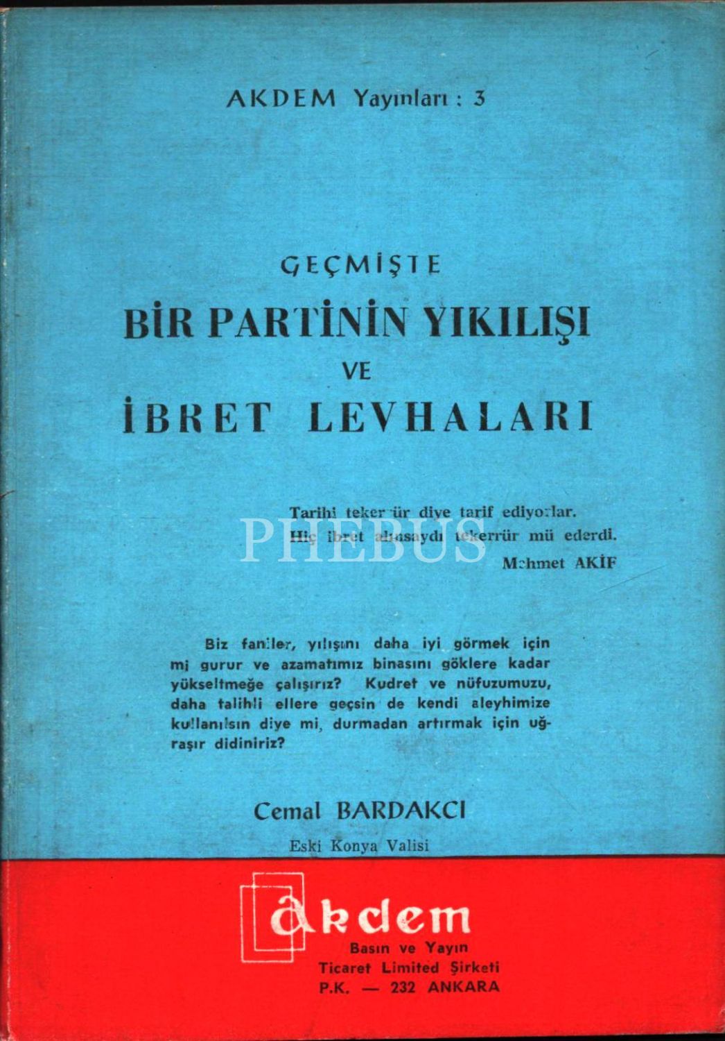 GEÇMİŞTE BİR PARTİNİN YIKILIŞI VE İBRET LEVHALARI, Cemal Bardakcı, Akdem Yayınları, Ankara, 1961, 52 sayfa