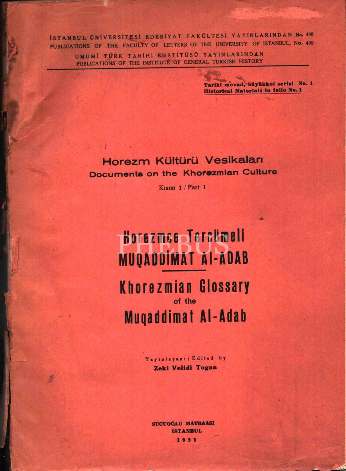 HOREZM KÜLTÜRÜ VESİKALARI- I. Kısım: Horezmce Tercümeli Muqaddimat al-Adab, yay. Zeki Velidi Togan, İÜ Edebiyat Fak. Yay., İstanbul, 1951, 576 sayfa
