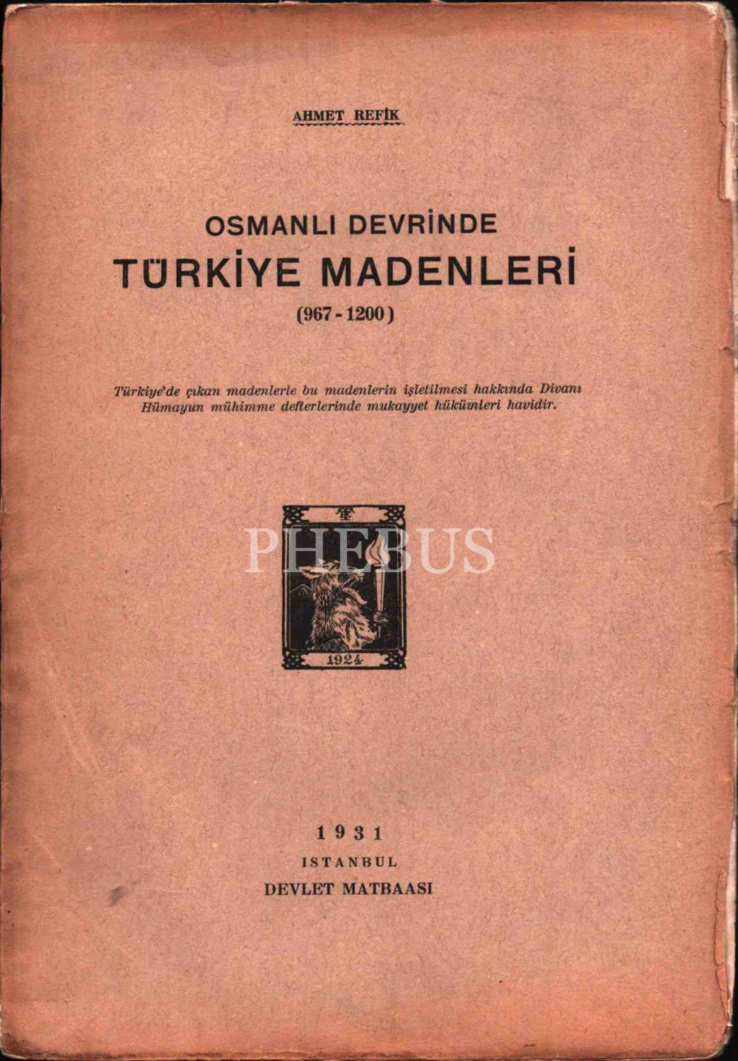 OSMANLI DEVRİNDE TÜRKİYE MADENLERİ, Ahmet Refik, Devlet Matbaası, İstanbul, 1931, 60 sayfa
