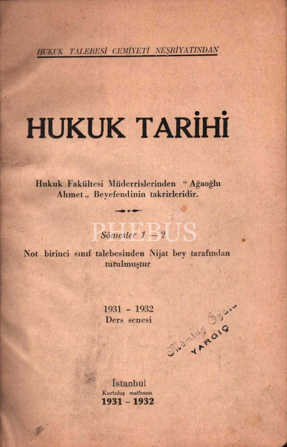 HUKUK TARİHİ (Hukuk Fak. Müderrislerinden Ağaoğlu Ahmet Beyefendinin takrirleridir), Hukuk Talebesi Cemiyeti Neşriyatı, 1931-32, İstanbul, 189 sayfa