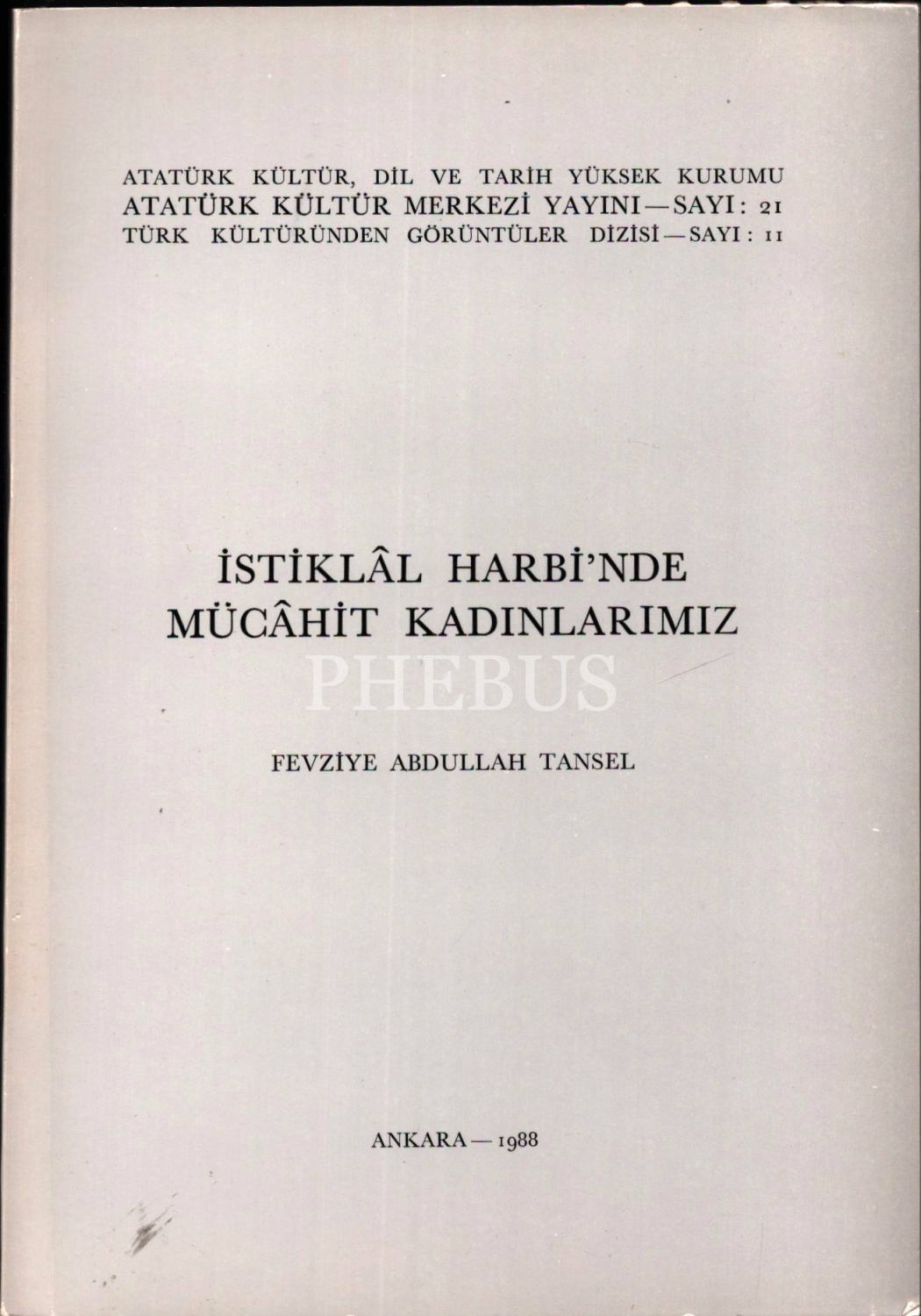 İSTİKLÂL HARBİ´NDE MÜCÂHİT KADINLARIMIZ, Fevziye Abdullah Tansel, Atatürk Kültür Merkezi Yayını, Ankara, 1988, 181 sayfa
