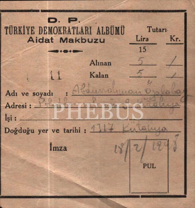 D.P. Türkiye Demokratları Albümü aidat makbuzu, 10x11 cm