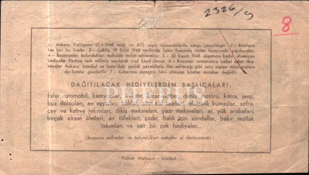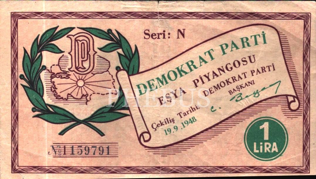 1948 tarihli Demokrat Parti Eşya Piyangosu bileti, 14x8 cm