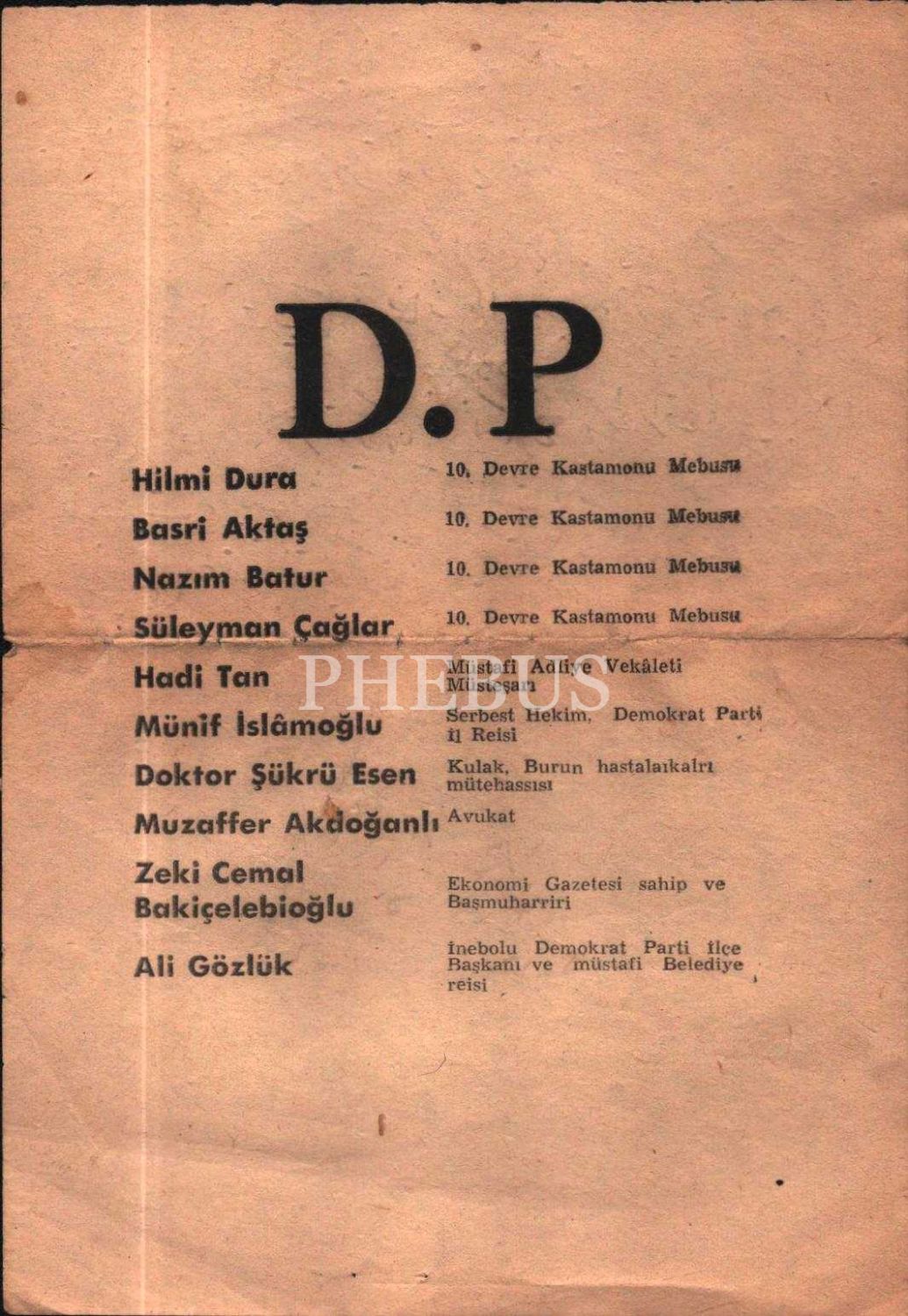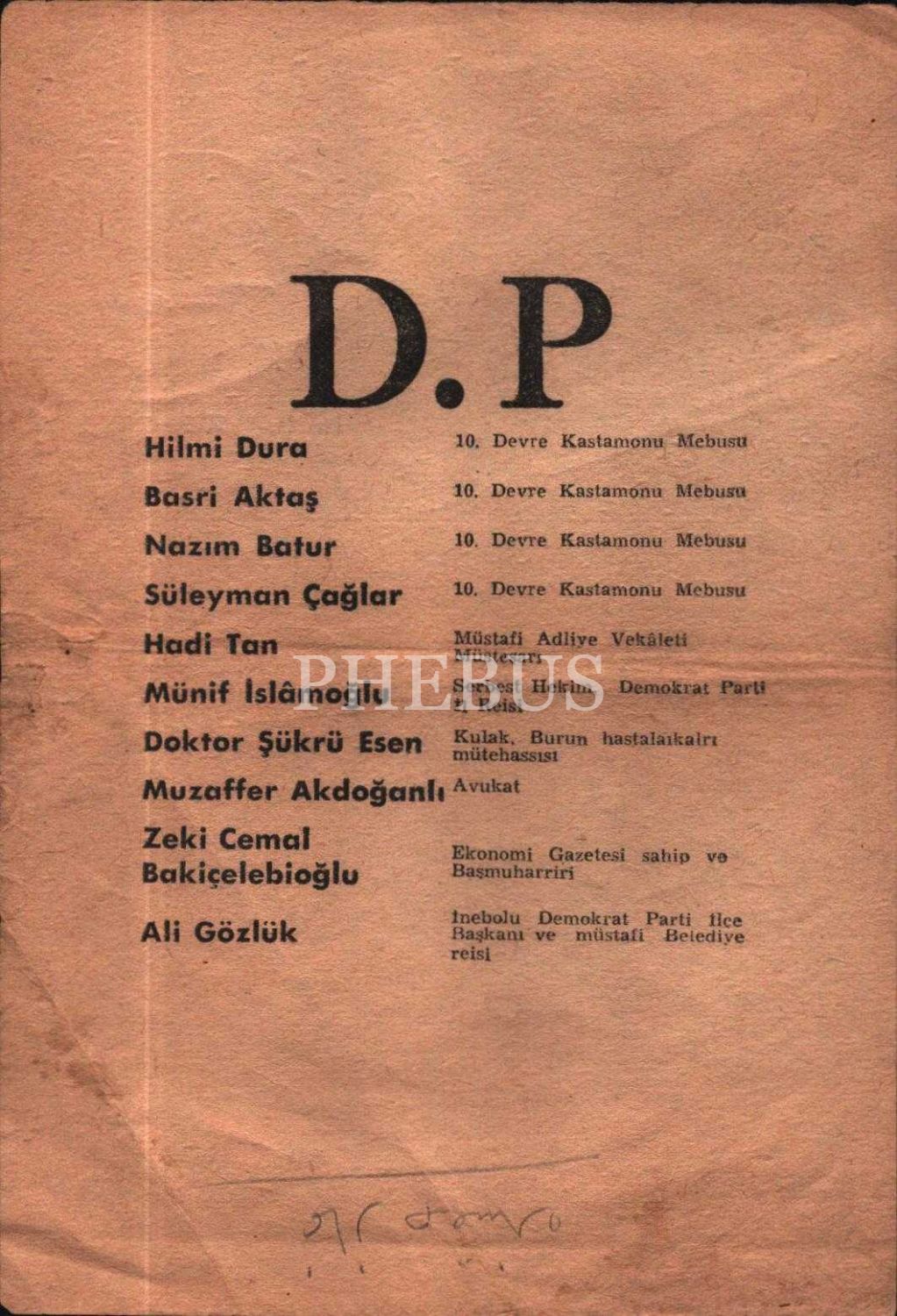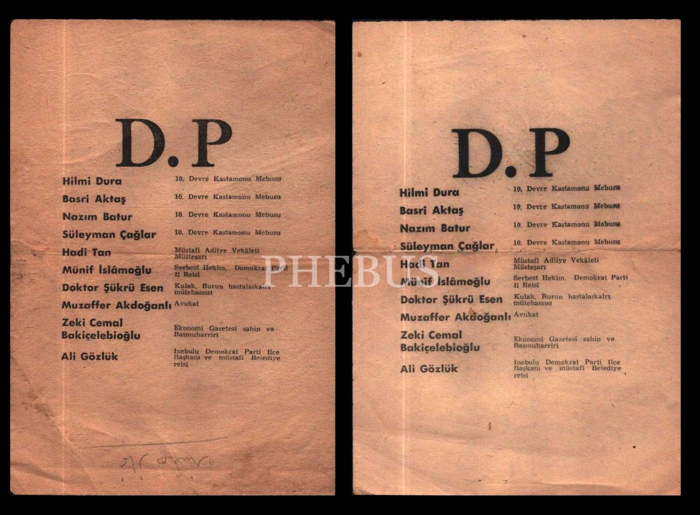 Unvanlarıyla birlikte Demokrat Partili isimlerin iki sayfalık listesi, 14x20 cm