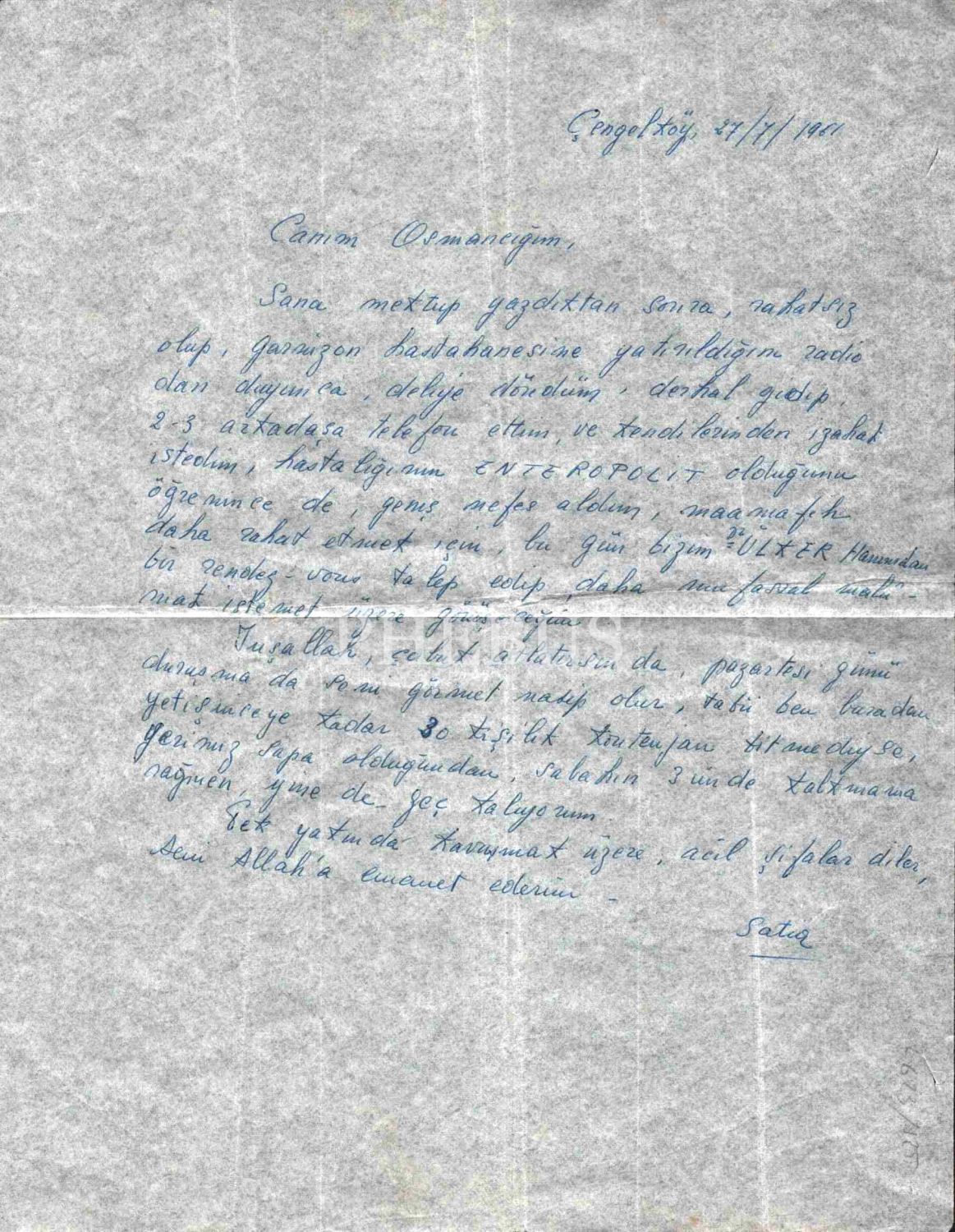 "27/7/1961 Canım Osmancığım, Sana mektup yazdıktan sonra, rahatsız olup, garnizon hastahanesine yatırıldığını [?] olan duyunca, deliye döndüm, derhal gidip, 2-3 arkadaşa telefon ettim, ve kendilerinden izahat istedim, hastalığının ENTEREPOLIT olduğunu öğrenince de, geniş nefes aldım, maamafih daha rahat etmek için, bu gün bizim Dr. ÜLKER Hanımdan bir randevu talep edip, daha mufassal malûmat istemek üzere görüşeceğim..."