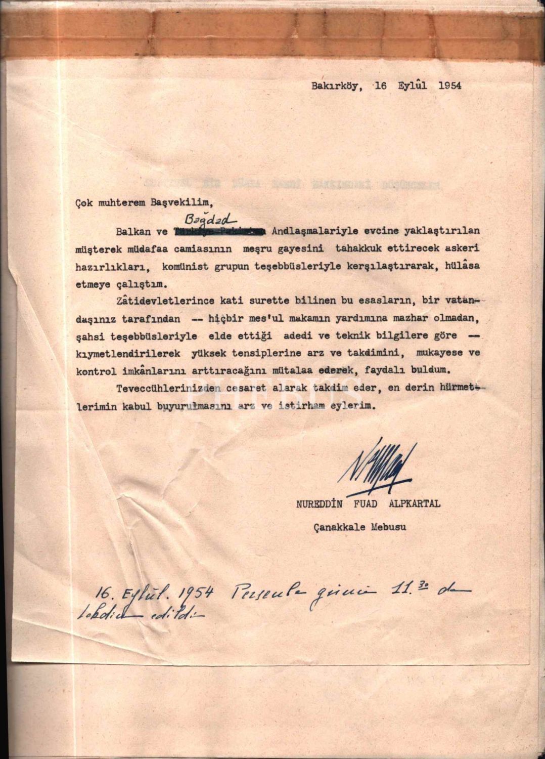 "Bakırköy 16 Eylül 1954, Çok muhterem Başvekilim, Balkan ve Bağdad Andlaşmalariyle evcine yaklaştırılan müşterek müdafaa camiasının meşru gayesini tahakkuk ettirecek askeri hazırlıkları, komünist grupun teşebbüsleriyle karşılaştırarak, hülâsa etmeye çalıştım. Zâtidevletlerince kati surette bilinen bu esasların, bir vatandaşınız tarafından -- hiçbir mes´ul makamın yardımına mazhar olmadan, şahsi teşebbüsleriyle elde ettiği adedi ve teknik bilgilere göre -- kıymetlendirilerek yüksek tensiplerine arz ve takdimini, mukayese ve kontrol imkânlarını arttıracağını mütalaa ederek, faydalı buldum. Teveccühlerinizden cesaret alarak takdim eder, en derin hürmetlerimin kabul buyurulmasını arz ve istirham eylerim. Nureddin Fuad Alpkartal - Çanakkale Mebusu (16 Eylûl 1954 Perşembe günü 11.30 da takdim edildi.)"